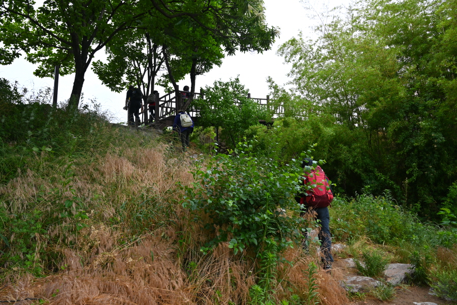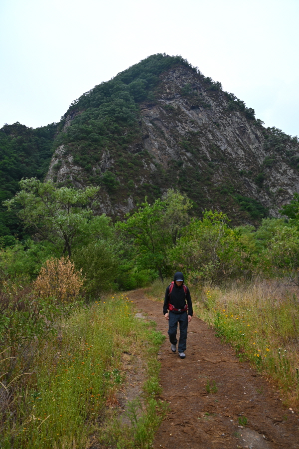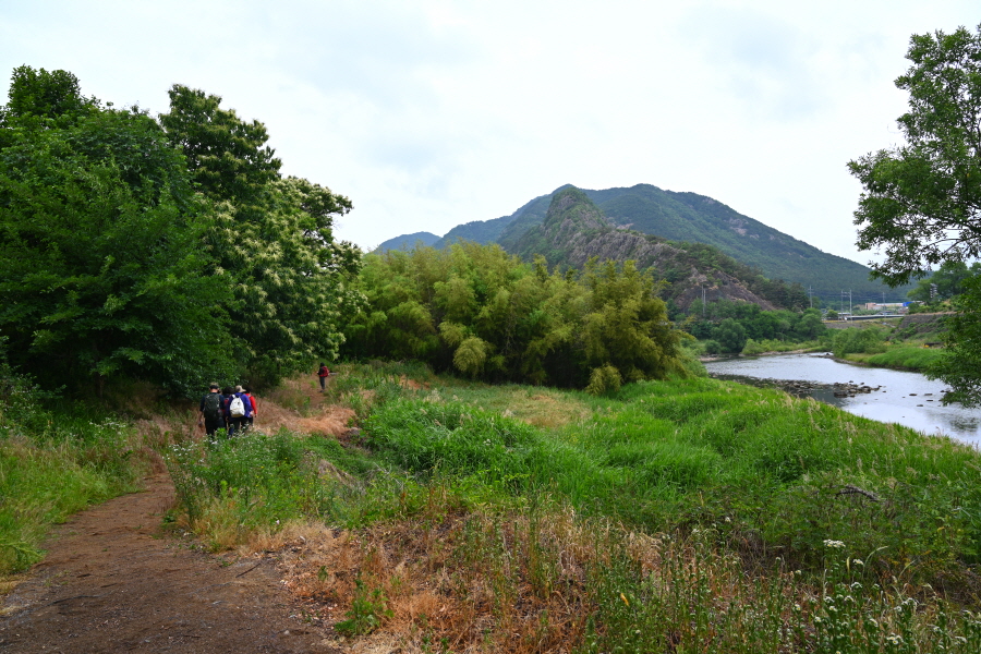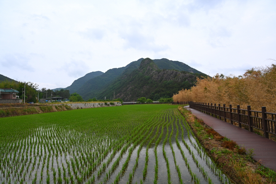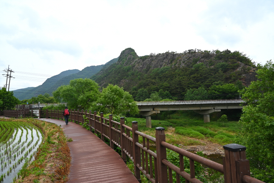 모내기를 끝낸 논두렁을 끼고 난 덱 길을 갑니다. 정면 바위 능선은 사군봉에서 흘러내린 암릉이 칼날 같이 예리 해 칼산으로 불리는데, 멀리서 보면 그 모습이 꼭 호랑이를 닮아 위압감을 줍니다.