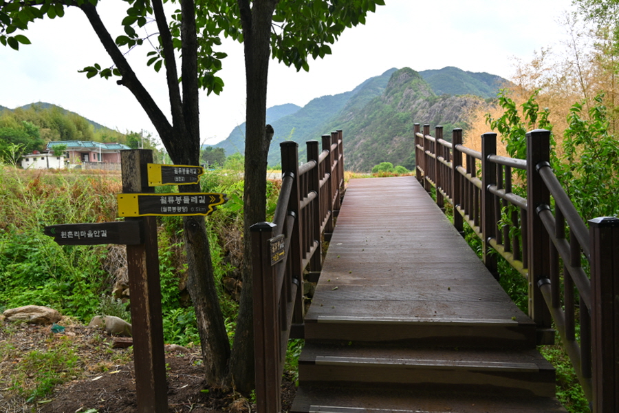 월류봉 둘레길은 3코스인데 1코스는 월류봉광장~원촌교~완정교를 잇는 '여울 소리길(2.7㎞)', 2 코스는 완정교~목교~우매리까지 백화산 자락을 걷는 '산새'소리길(3.2㎞)'이며, 3코스는 우매리~반야교~ 반야사에서 끝나는 '풍경 소리길(2.5㎞)'로 꾸며졌습니다.