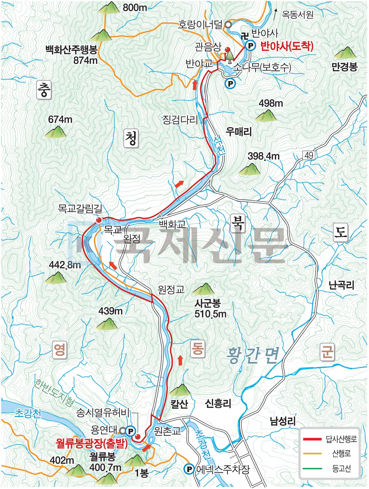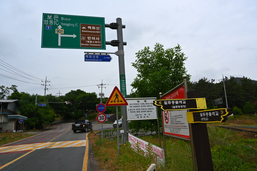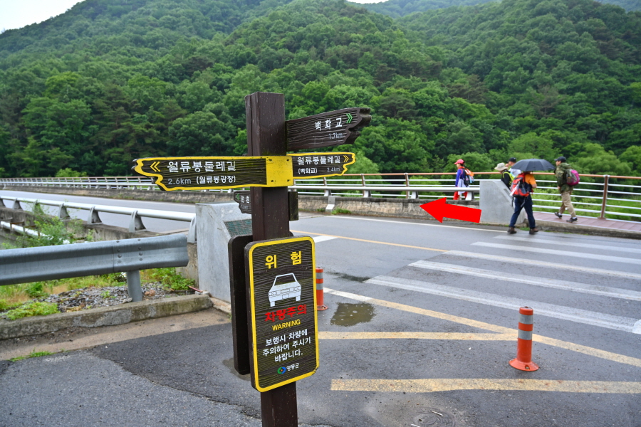 영동군 황간면 원촌리 월류봉 광장에서 송시열 유허비~원촌교~원정교~목교 갈림길~백화교~두곳의 징검다리~반야사 방면 도로~반야교~백화산·반야사 갈림길~관음상 앞 갈림길~둘레길·반야사 갈림길~잠수교~반야사에 도착합니다. 산행거리는 약 8.4㎞ 이며, 3시간 안팎이 걸립니다.