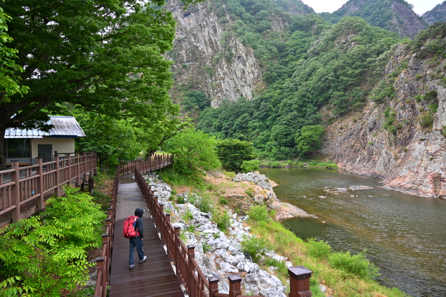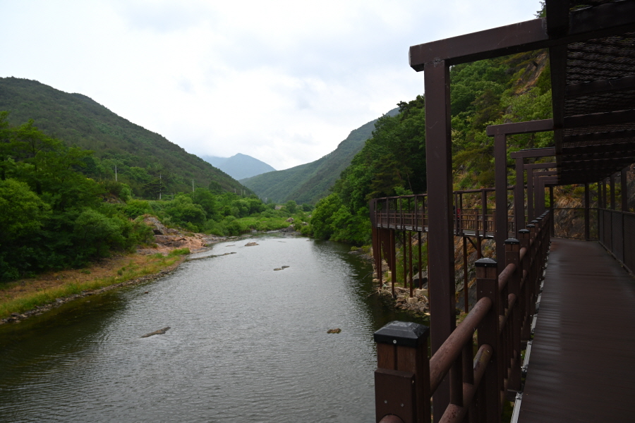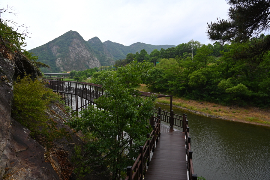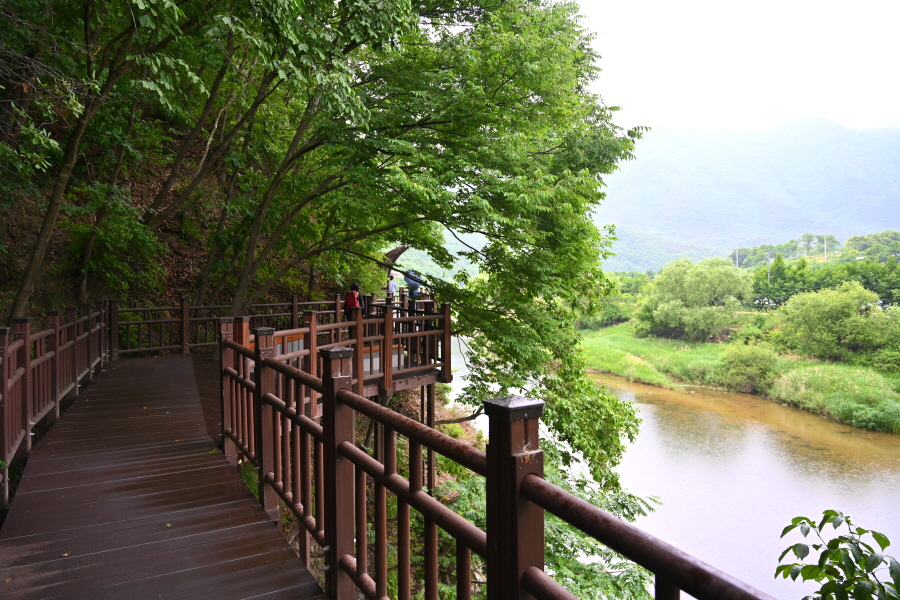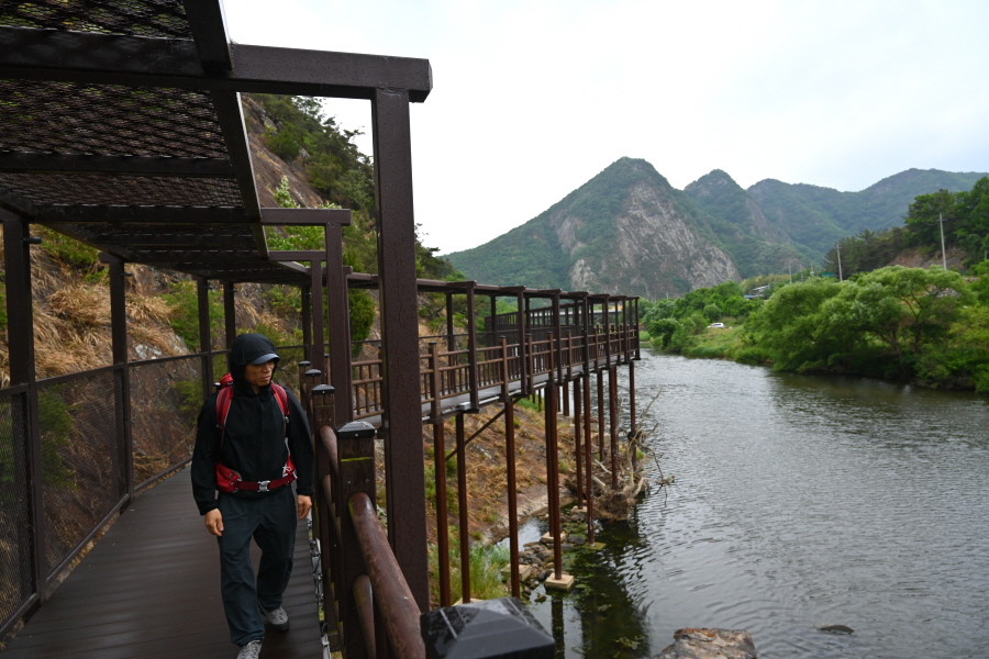 구불구불 강을 따라 절벽에 선반을 달아내듯 세운 목교 위를 걷는 길입니다.