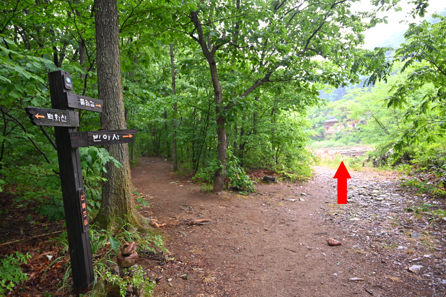 둘레길 안내도가 서 있는 공터에서 둘레길(1.5㎞)과 반야사는 오른쪽 계곡을 건너갑니다. 직진은 백화산 방향.