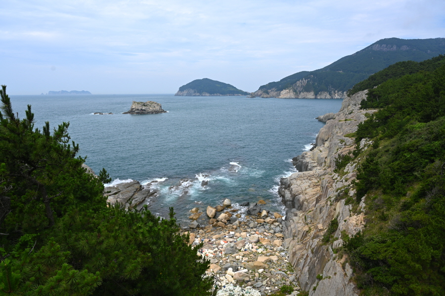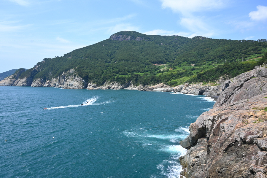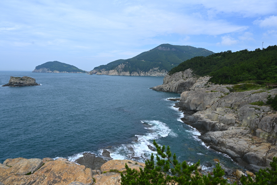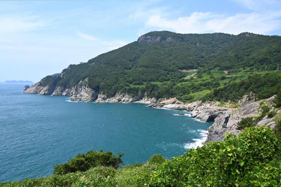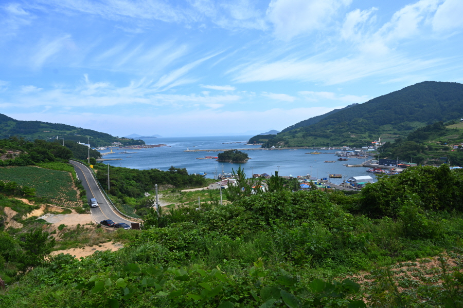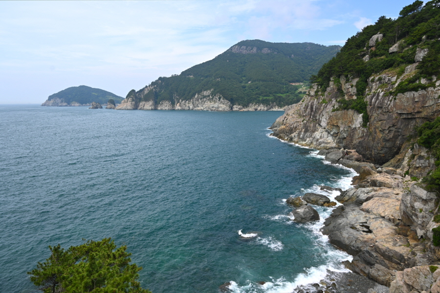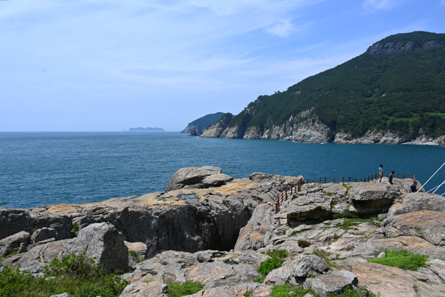 멀리 정면에는 욕지도의 천왕산 대기봉이 산성처럼 막아섰습니다. 왼쪽에는 유동등대와 이무기가 변한 총각을 사랑한 세 명의 여인이 바위가 되었다는 '삼여도(三礖島)' 의 기암절벽은 쪽빛 바다와 어울려 한 폭의 그림 같습니다.
