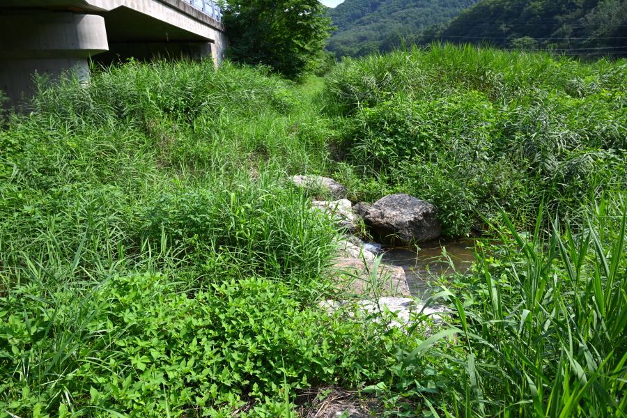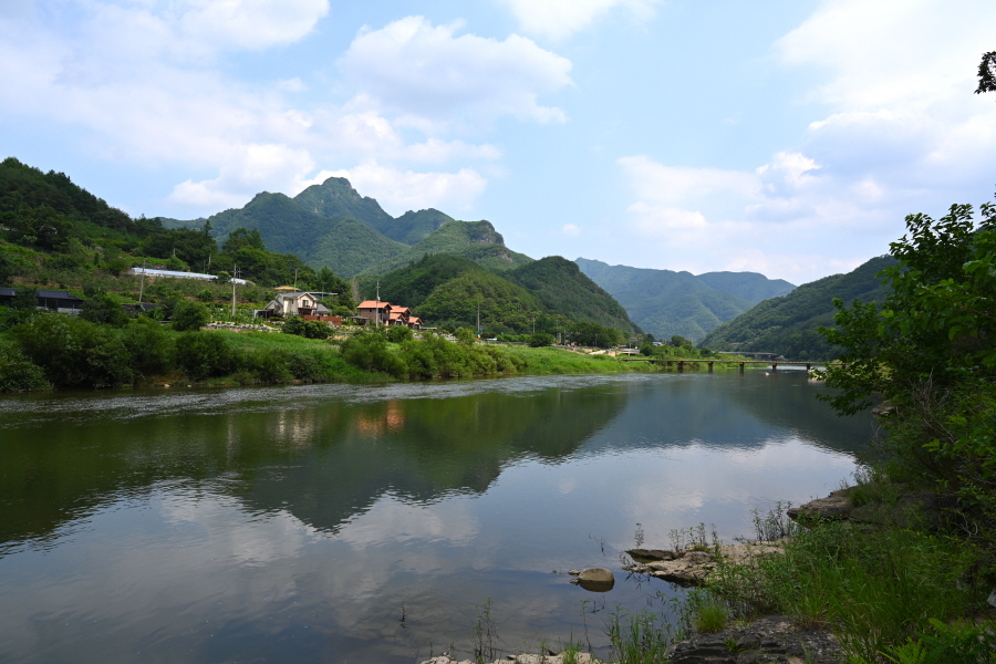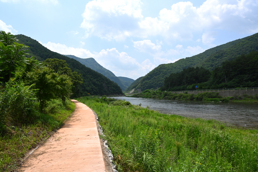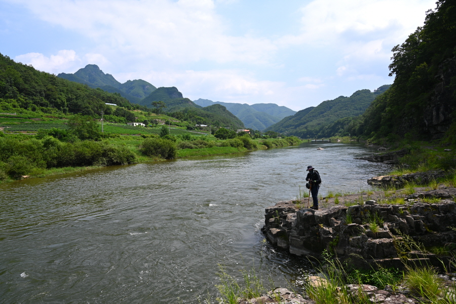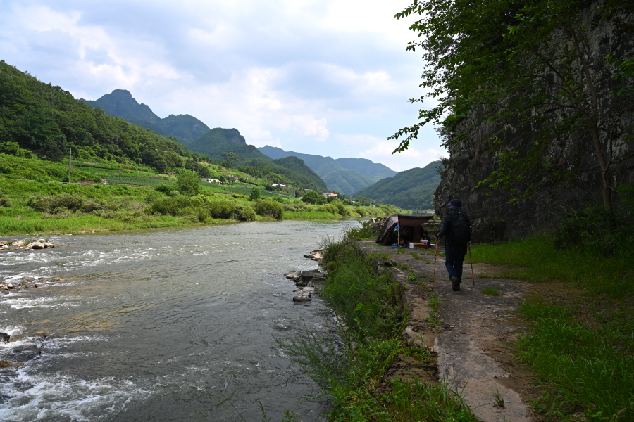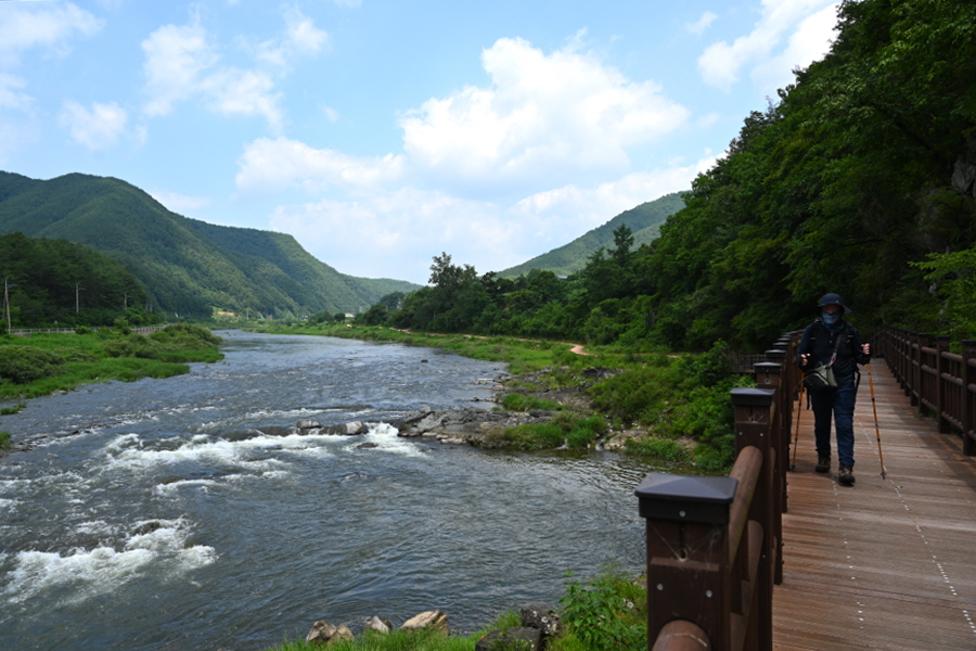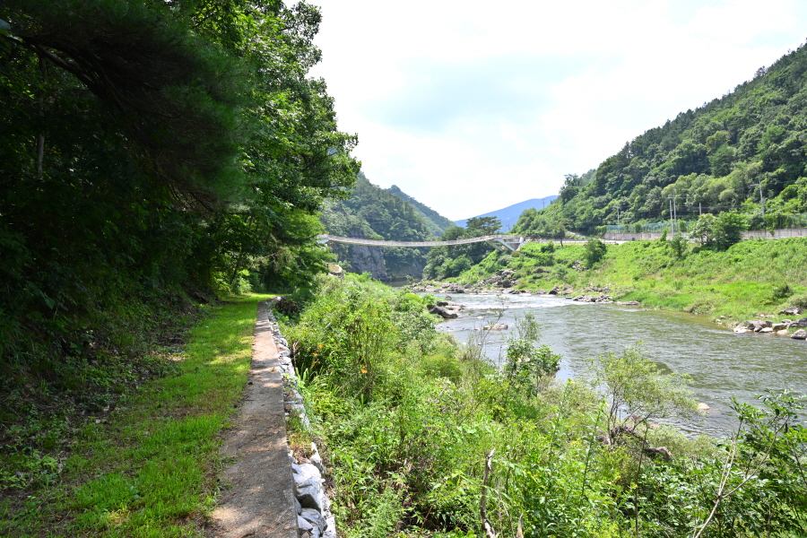 고계마을 아래의 가지계곡에 놓인 작은 징검다리를 건너 강변의 콘크리트길을 갑니다.