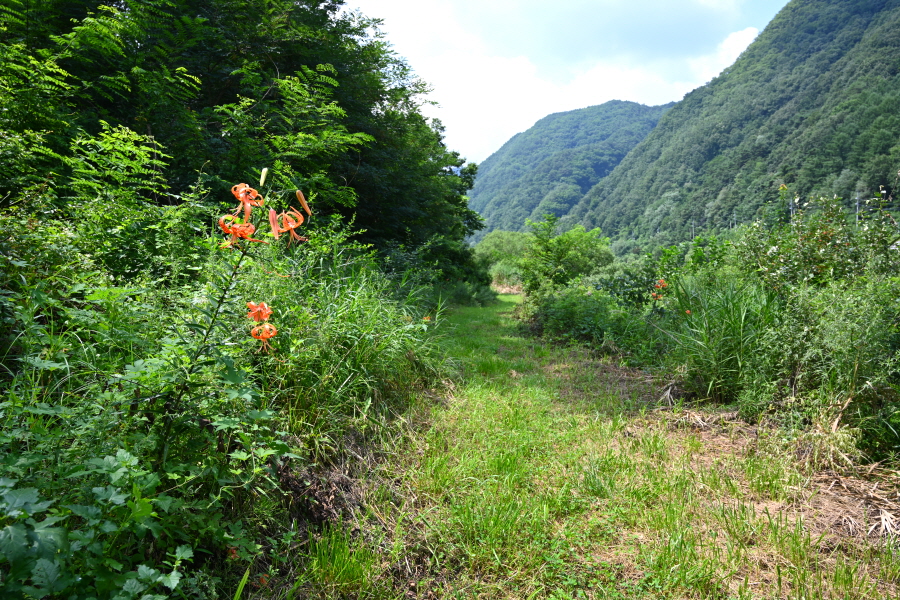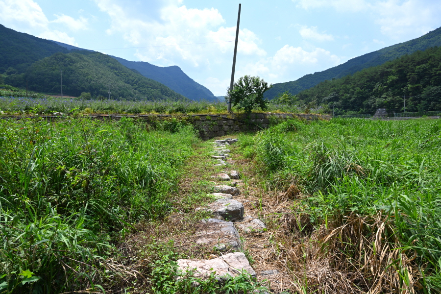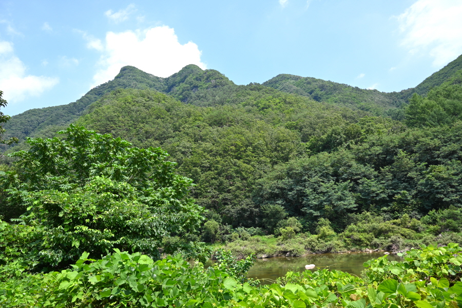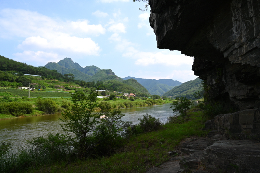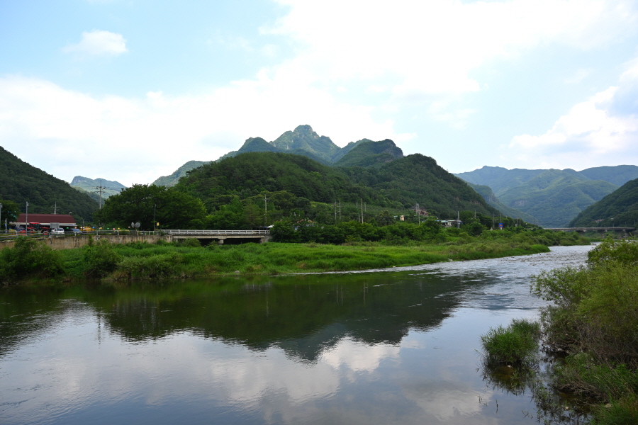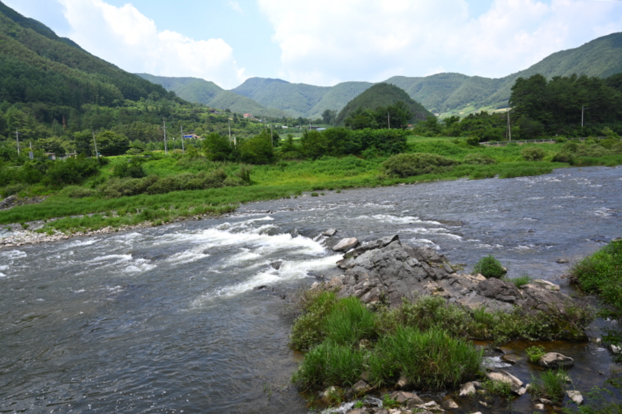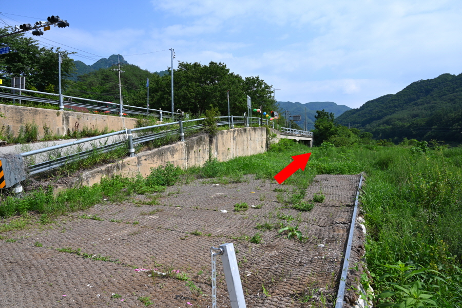 고계마을 아래의 가지계곡에 놓인 작은 징검다리를 건너 강변의 콘크리트길을 갑니다.