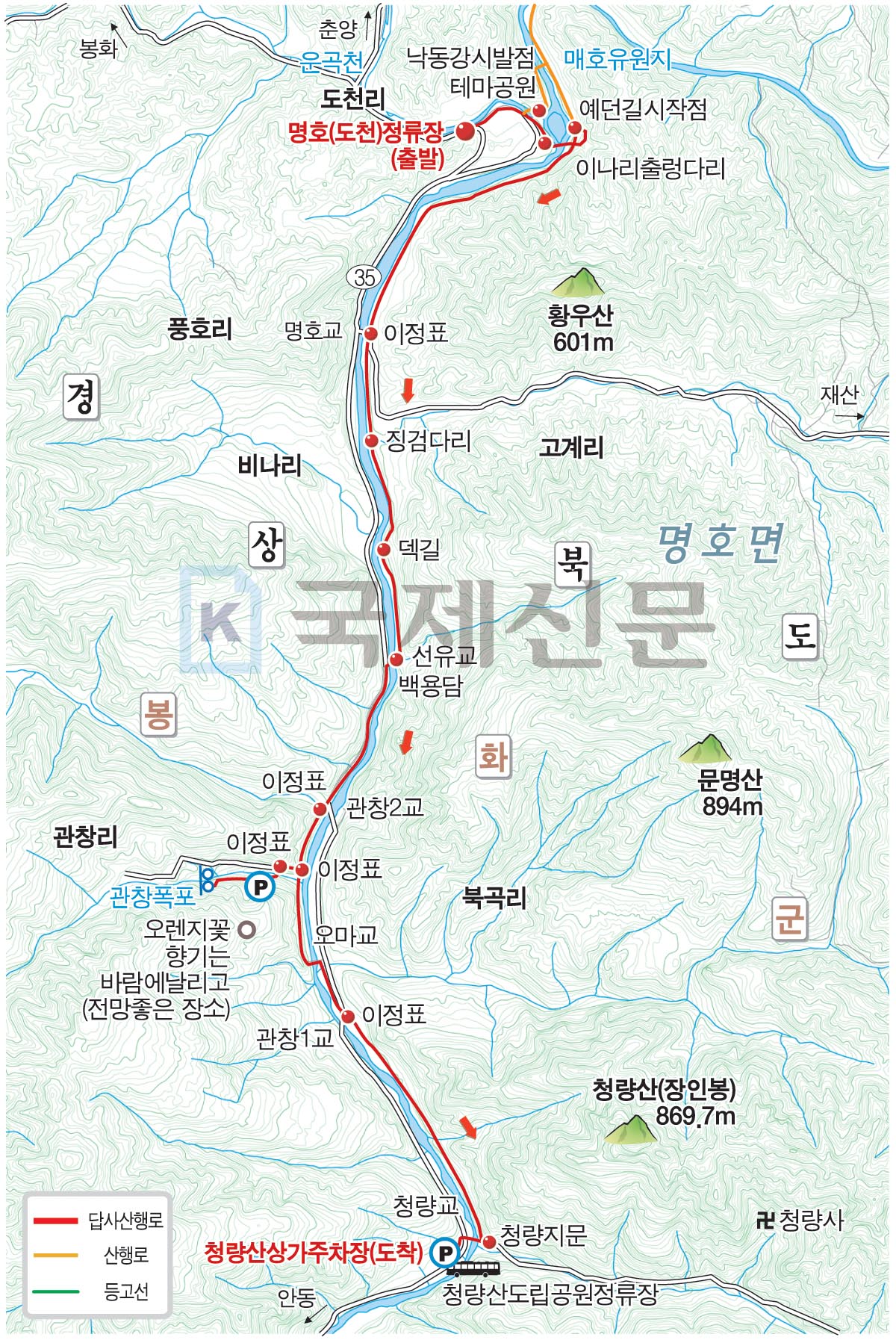 봉화군 명호면 도천리 명호(도천)버스 정류장을 출발해 낙동강 시발점 테마 공원~이나리 출렁다리~낙동강 예던길 시발점~명호교~덱 길~백용담 출렁다리~관창 2교~관창폭포 갈림길~(관창폭포)~오마교~관창 1교~청량산 입구 청량지문에서 청량교를 건너 청량산 상가 주차장에 도착한다. 봉화 낙동강 예던길 거리는 약 9.1㎞ 이며, 3시간 안팎이 걸립니다. 낙동강과 청량산 주변 경치가 워낙 빼어나 산행시간은 별 의미가 없습니다.