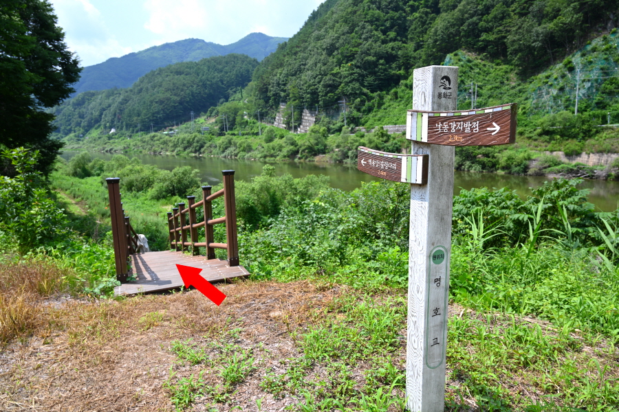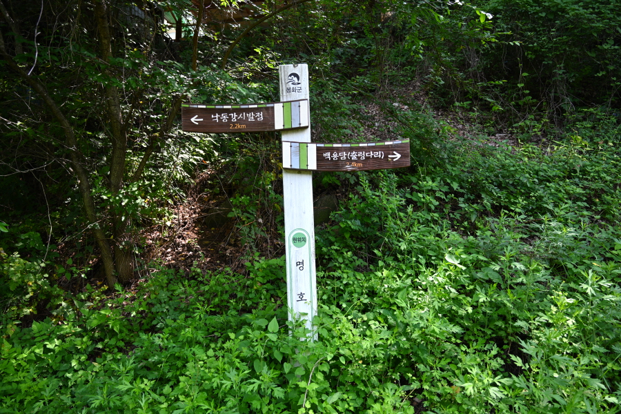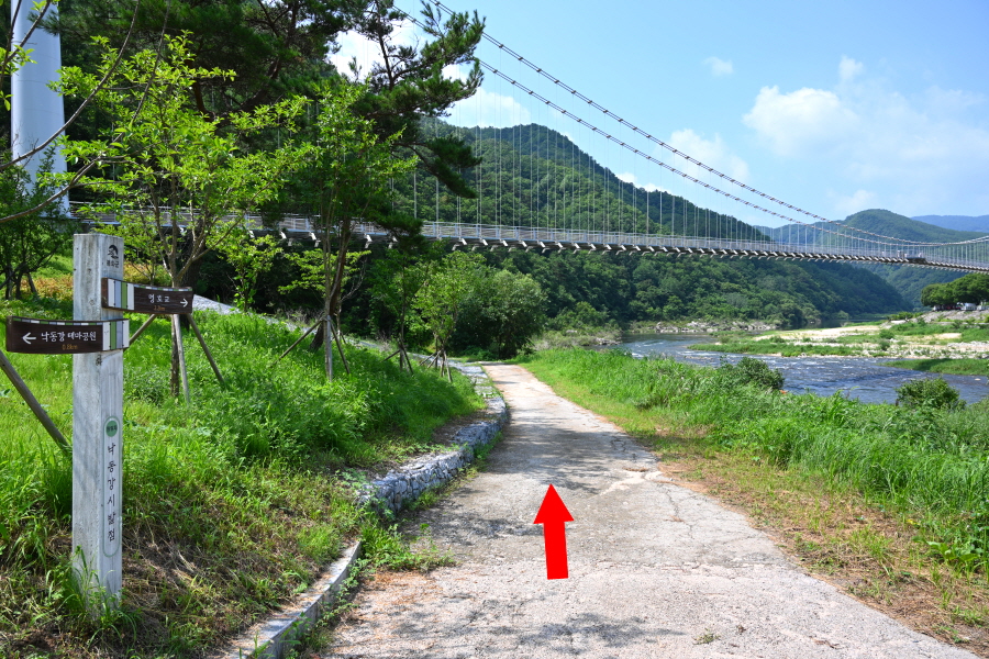 봉화래프팅을 왼쪽으로 돌아 출렁다리에 올라섭니다. 다리 가운데서 두 강이 만난다는 뜻인 ‘이(二)나리’의 유래가 된 합수점을 보고 다리를 건너 낙동강 시발점 이정표에서 명호교(2.4㎞)로 향합니다.
