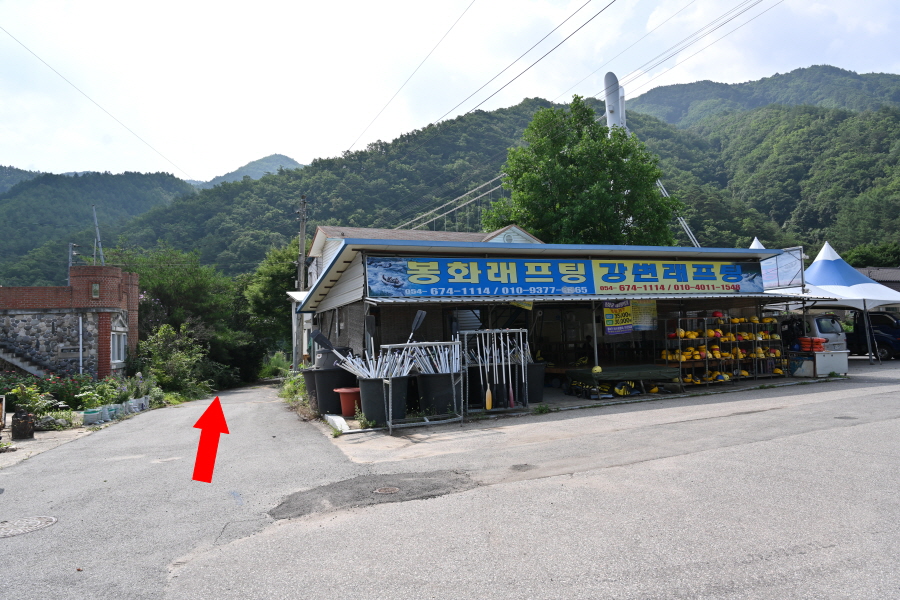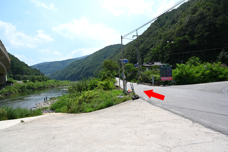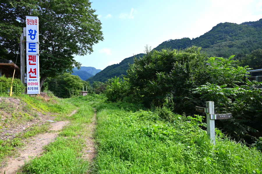 관창 1교 아래를 지나 강둑에 올라가면 청산 농원 황토펜션 앞에 올라갑니다. 청량산 입구(1.8㎞)는 오른쪽으로 꺾습니다.