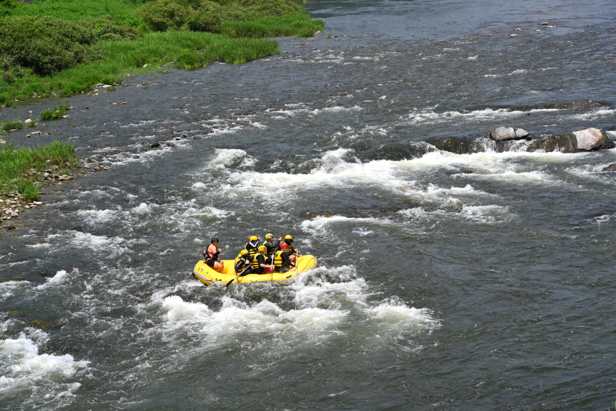 이나리 출렁다리 아래에서 출발해 래프팅을 즐기던 한 팀이 비나리 앞의 여울에 고무보트가 걸려 빠져 나가려고 안간힘을 씁니다.