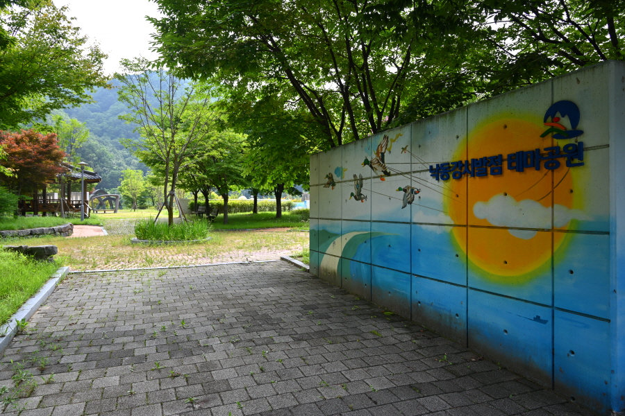 낙동강 시발점 테마공원은 명호면사무소 앞에서 운곡천에 놓인 도천교를 건너면서 시작됩니다. 강을 뜻하는 물길과 벽화로 명실상부한 낙동강의 상징물로 자리 잡았습니다.