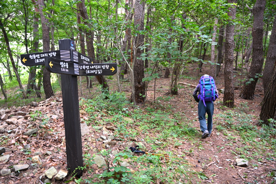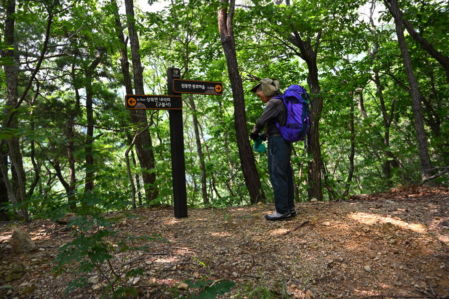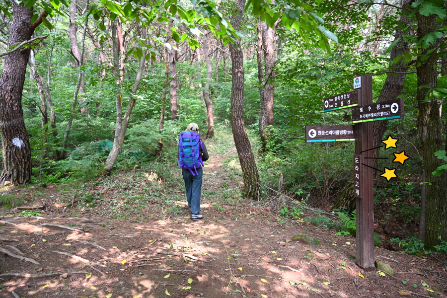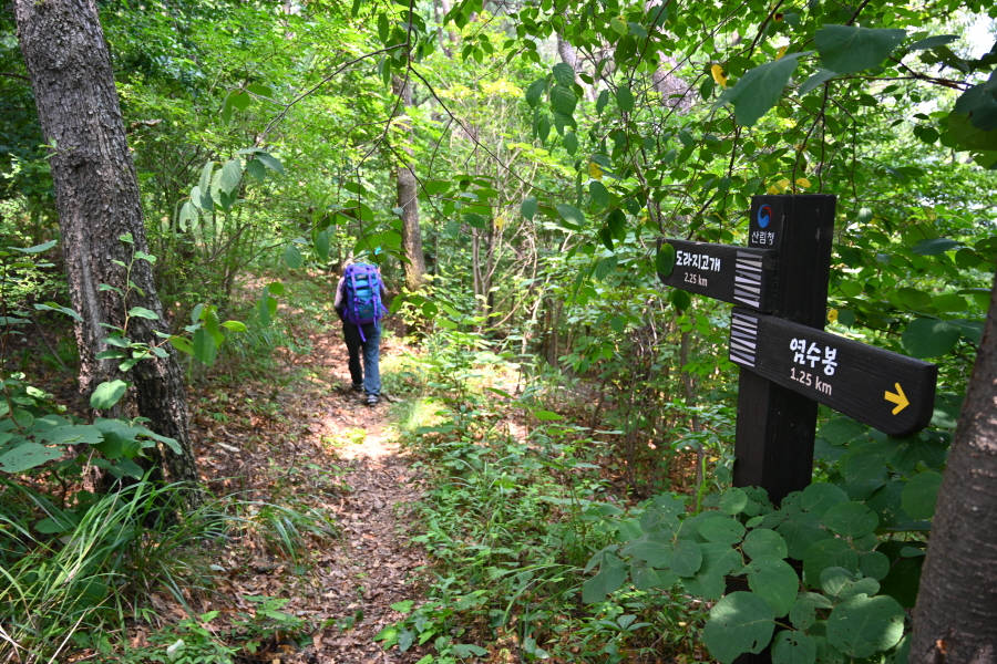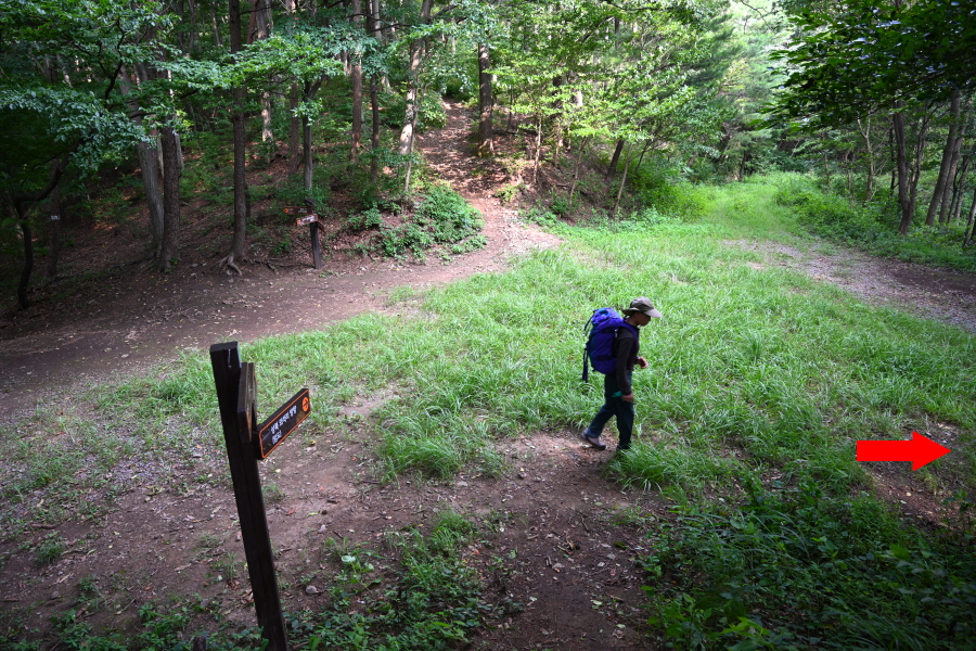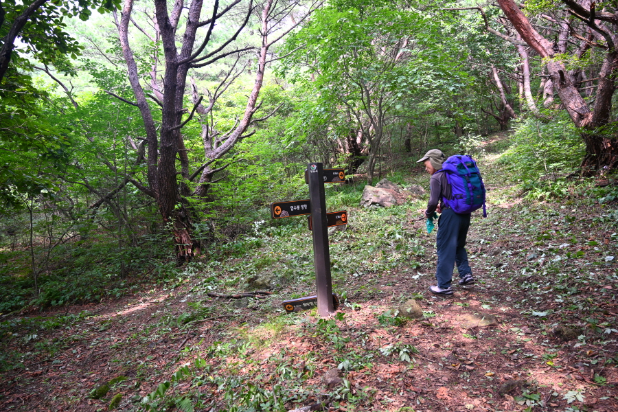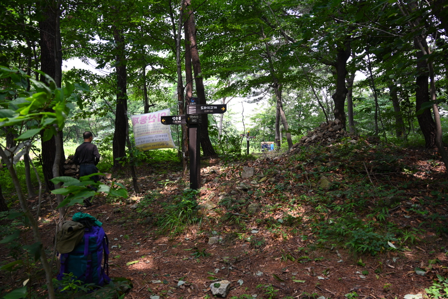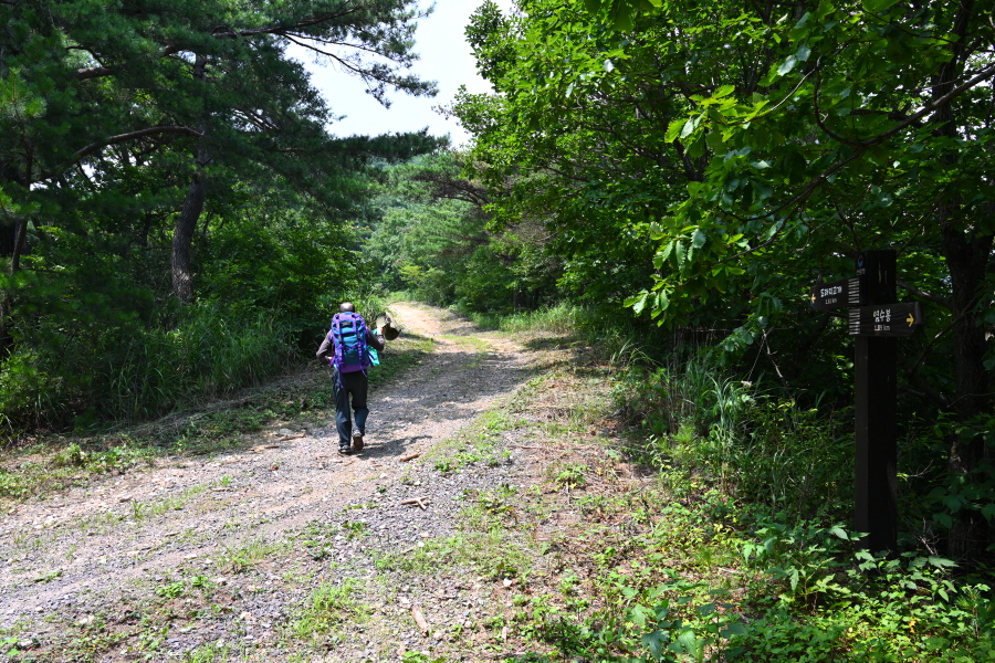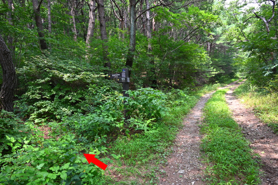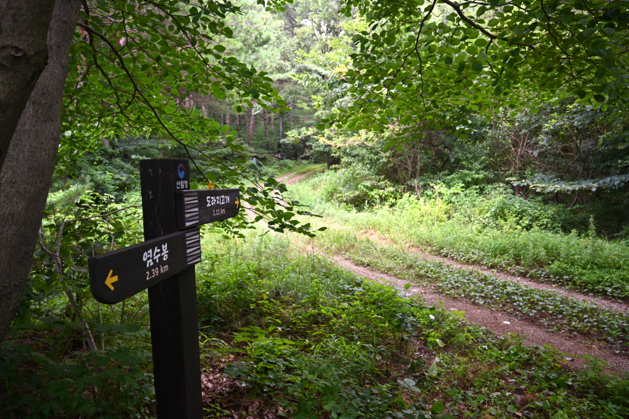 임도가 지나가며 사방으로 산길이 열립니다. 임도를 따라가도 되지만 오른쪽 도라지고개(2.69㎞)로 완만한 소나무 숲 능선을 탑니다. 직진하는 임도는 풍호마을로 내려가는 장터길이며, 왼쪽은 염수봉 방향인데 잠정 폐쇄됐습니다.