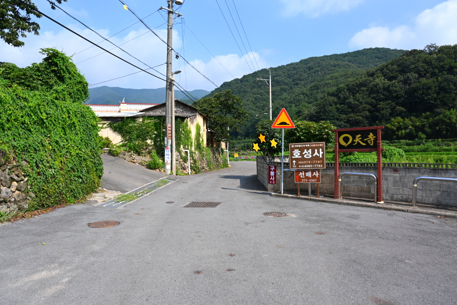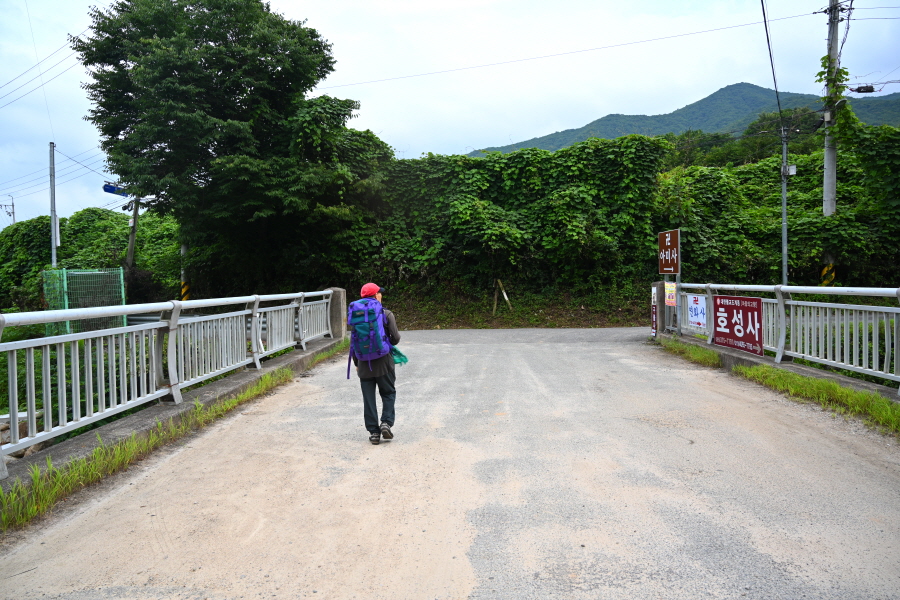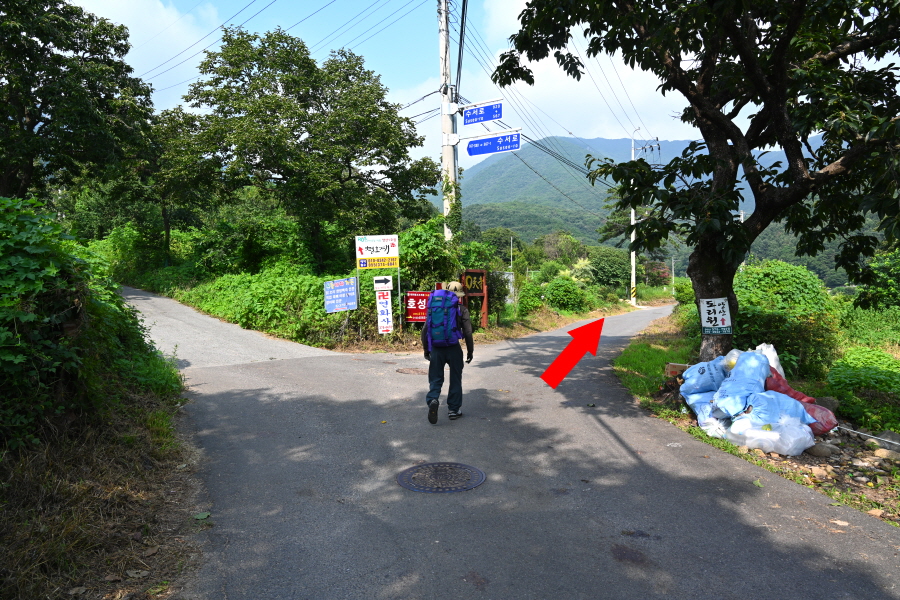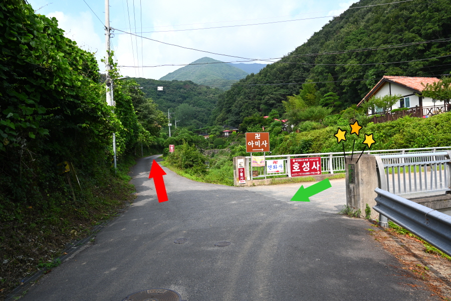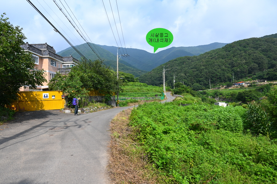 정면에 염수봉이 높게 막아서며 그 옆 잘록이는 취재팀이 오를 시살등 고개(내석재)입니다. 마을을 벗어나 내석천을 끼고 갑니다. 오전교 앞 갈림길에서 구불사로 직진합니다. 오른쪽 오전교 방향은 취재팀의 하산길입니다.