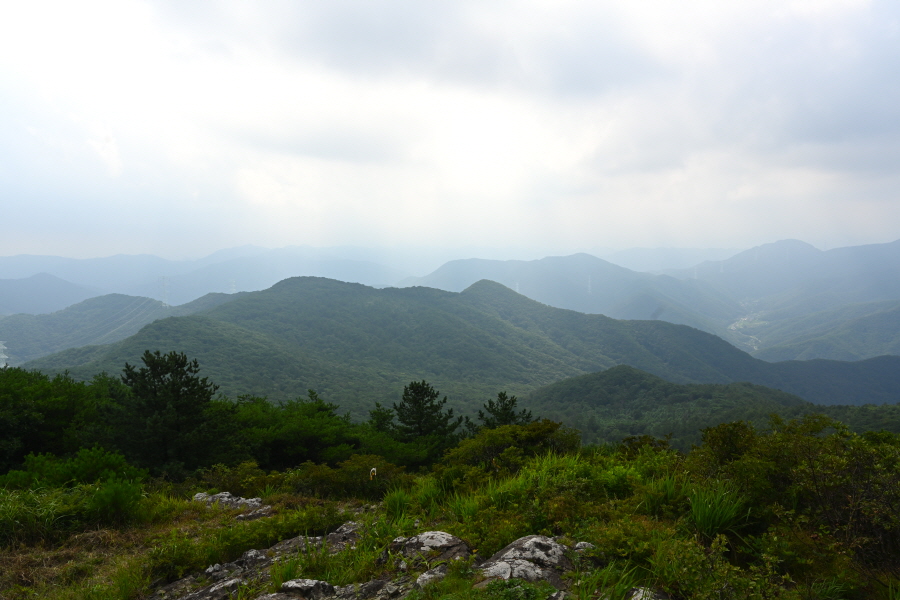 전망대와 습지 한 곳을 지나 도라지 고개에서 약 30분이면 오룡산 정상에 섭니다. 멀리 북동쪽의 영축산 정상에서 시계 반대 방향으로 채이등 시살등 배내골 천황산 재약산 재약봉 향로산 백마산 향로봉 금오산 천태산 염수봉 무척산 토곡산 에덴밸리 선암산 등이 펼쳐집니다.