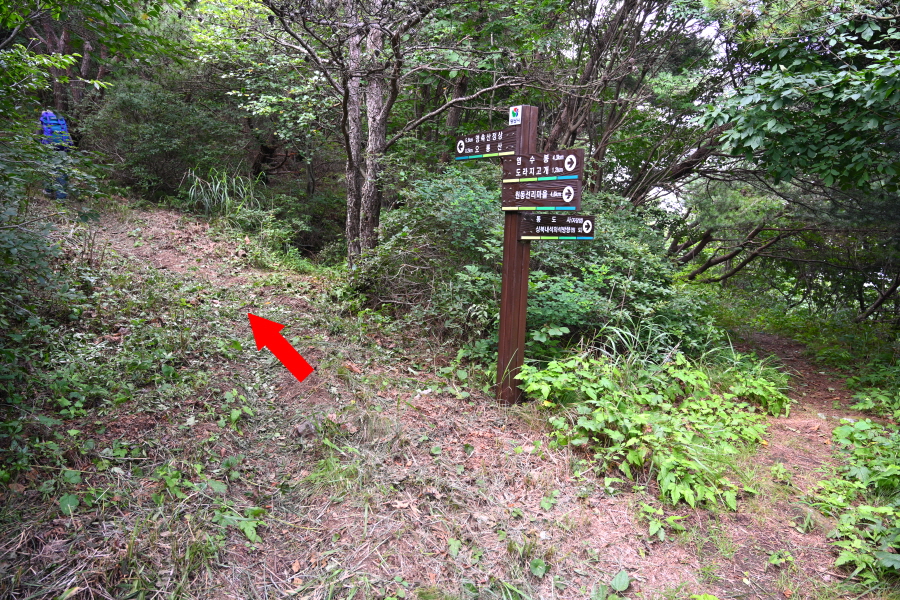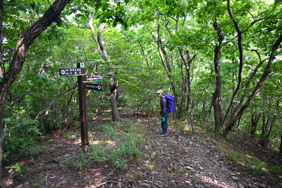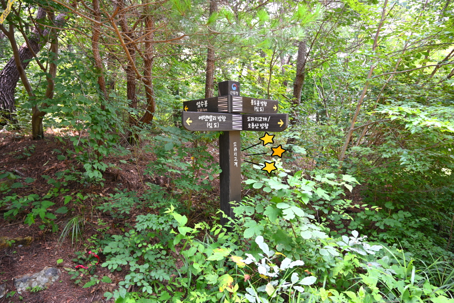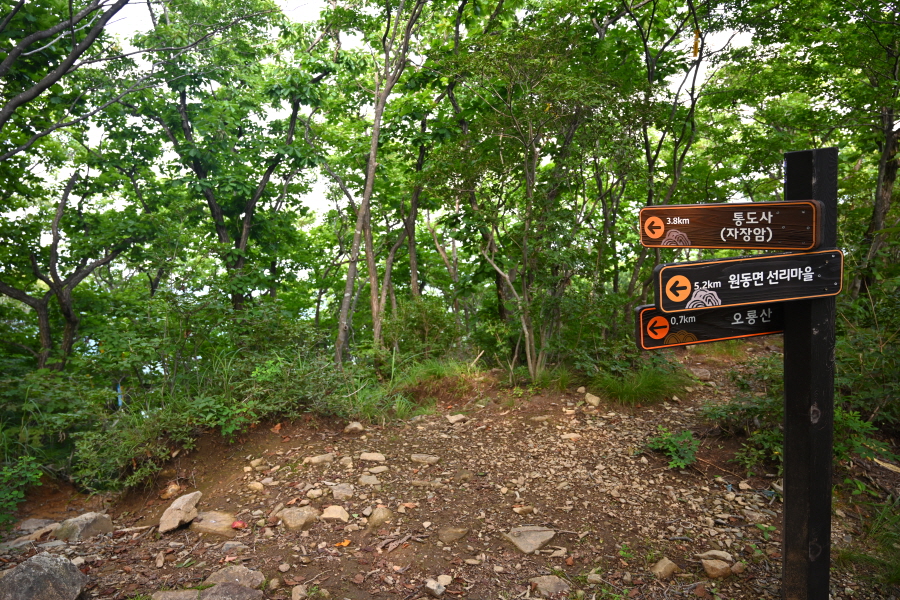 오룡산 정상까지 세 번의 갈림길이 나옵니다. 첫 번째 갈림길은 다시 만나며, 왼쪽 선리마을에서 올라오는 두 번째 갈림길과 오른쪽 통도사(자장암) 방향으로 내려가는 세 번째 갈림길에서 오룡산은 직진합니다.