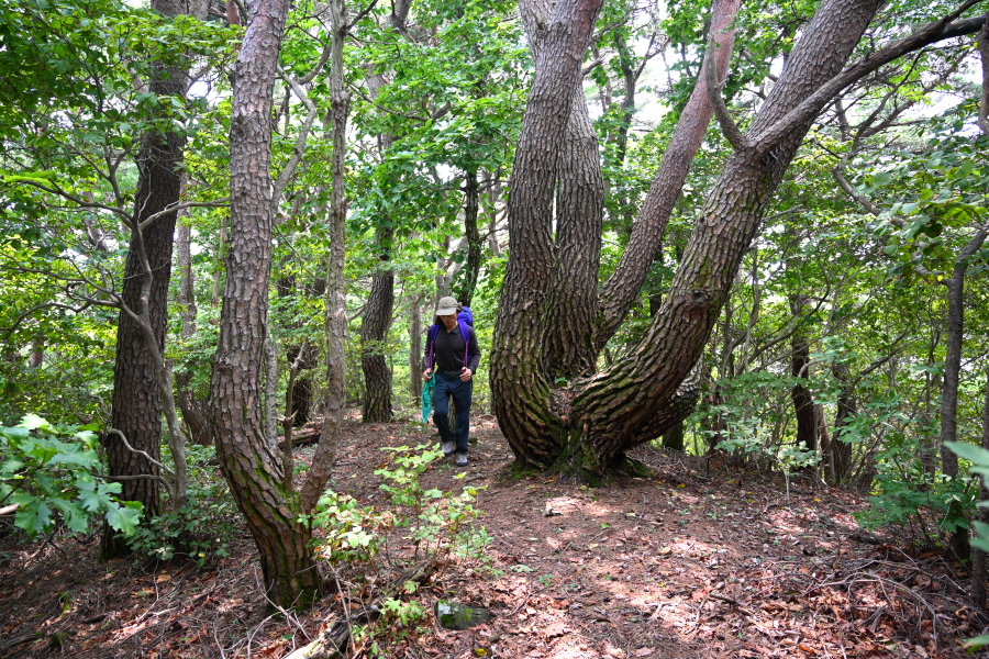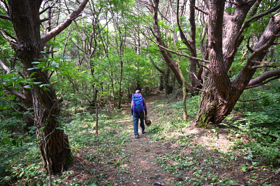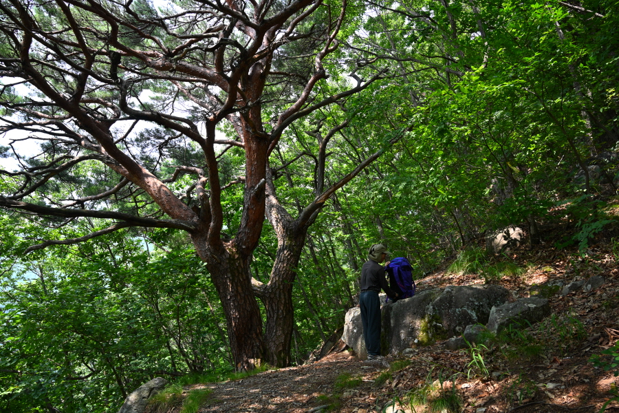 능선을 따라 구불구불한 길이 끝없이 올라갑니다. 풍호마을(3.1㎞) 이정표를 지나 작은 다리에서 40분이면 ‘V’자로 갈라진 아름드리 소나무 쉼터에 도착해 한숨을 돌립니다.