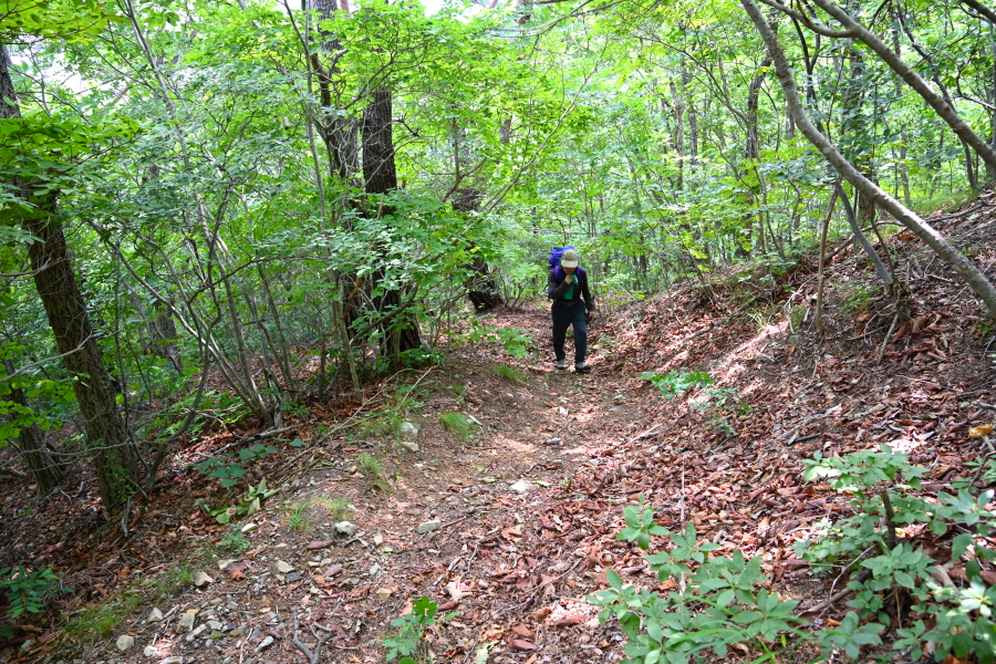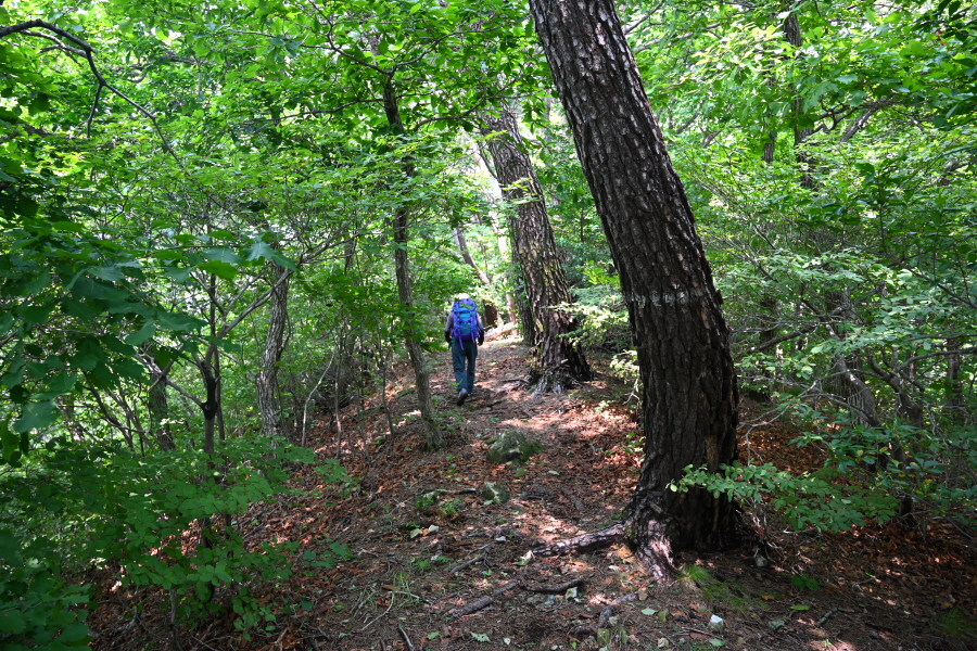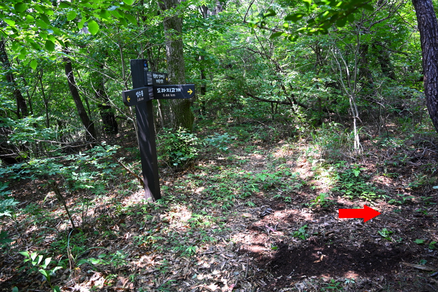 두 번의 임도를 지나 시살등 고개에서 35분이면 828m봉 삼거리에 도착해 오른쪽 도라지고개(0.44㎞)로 꺾습니다. 직진은 선리 방향.