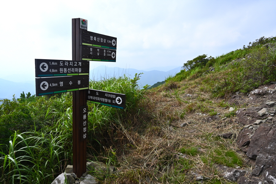 8분이면 임도가 지나가는 도라지고개에 도착해 오룡산(1.4㎞)·영축산 정상(7.7㎞)은 직진합니다. 왼쪽 임도는 원동면 선리방향.