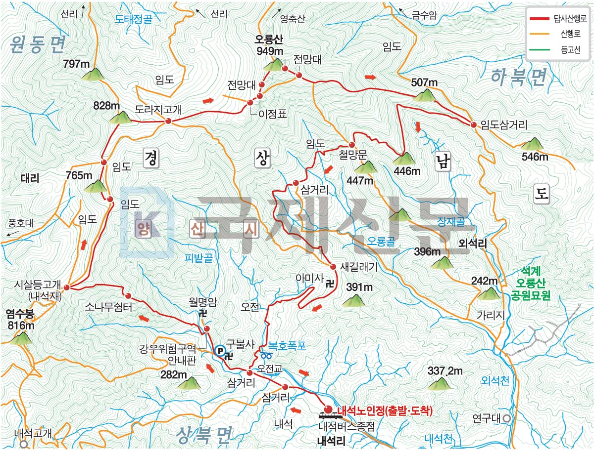 경남 양산시 상북면 내석리 내석노인정에서 출발해 내석고개 갈림길~오전교 앞 갈림길~구불사 주차장(장터길 갈림길)~강우 위험구역 안내판 갈림길~소나무 쉼터~시살등고개(내석재)~임도~765m봉~임도~828m봉 갈림길~도라지고개~오룡산 정상~안부 임도 삼거리~임도~아미사~오전교~내석 노인정으로 되돌아오는 원점회귀입니다. 산행거리는 약 17㎞이며, 6시간 30분 안팎이 걸립니다.
