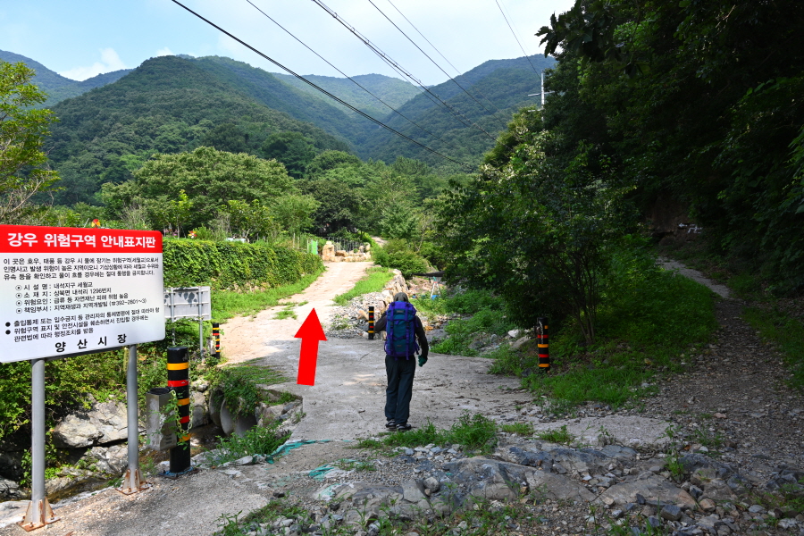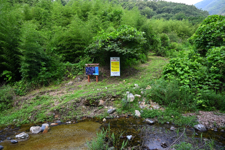 강우 위험구역 안내판 갈림길에서 왼쪽 피밭골의 작은 다리를 건너갑니다. 시집 가던 새색시가 물에 빠져 숨졌다는 행기소(각시소)는 개울을 정비하면서 흔적을 찾을 수 없습니다.