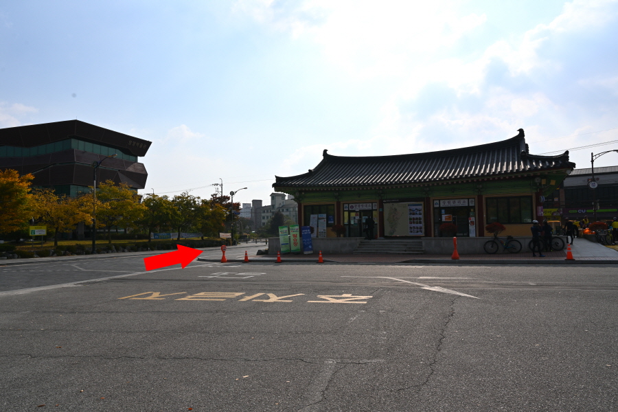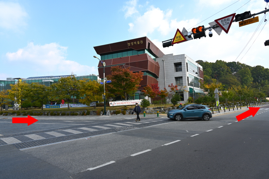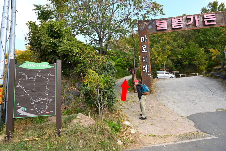 이번 산행은 상림공원 주차장에서 출발합니다. 승용차가 들어왔던 관광 안내소 왼쪽 도로를 나가 삼거리에서 함양 박물관 오른쪽 도로를 갑니다. 3분이면 여중 후문 쪽에 늘봄가든 입구가 나오며 최치원 산책로 들머리입니다.