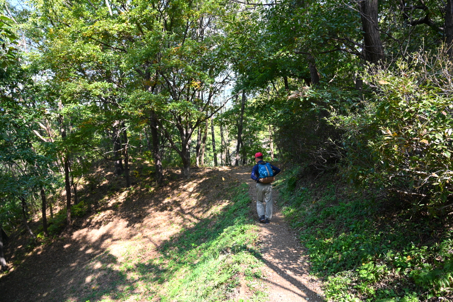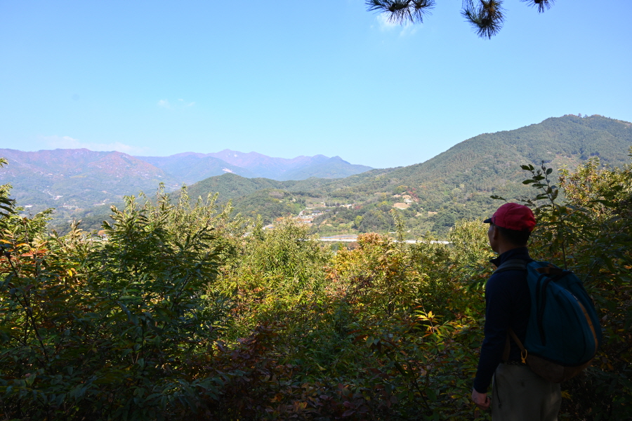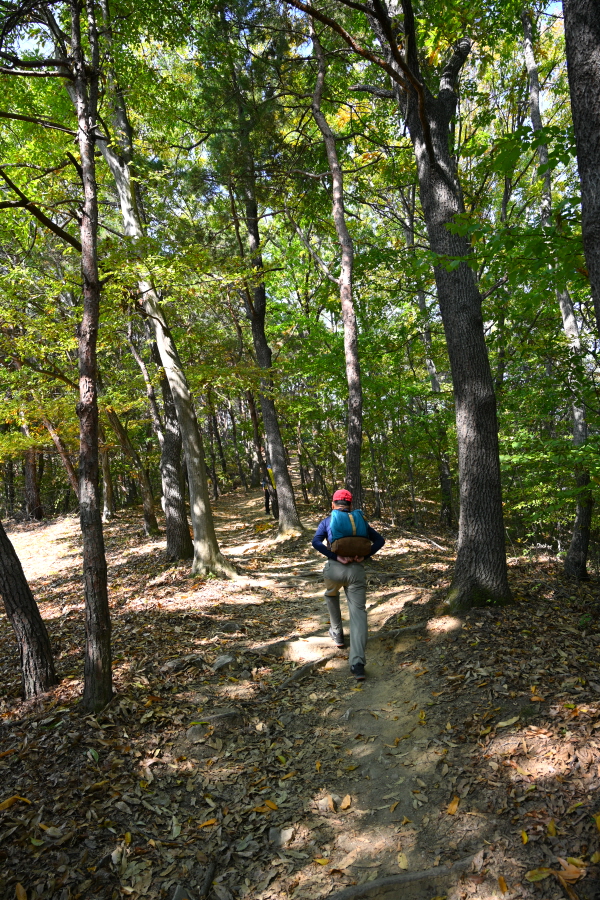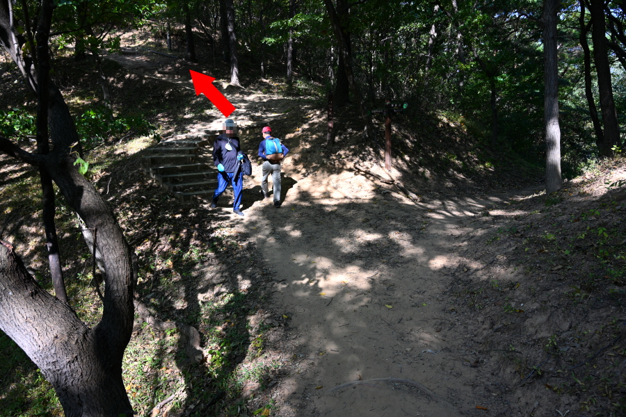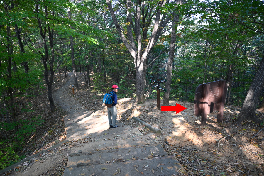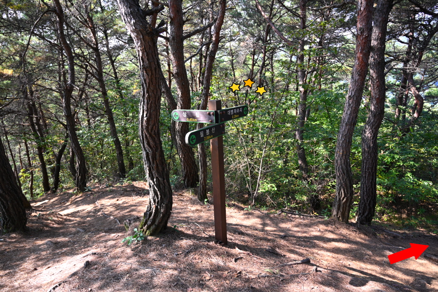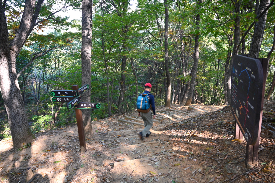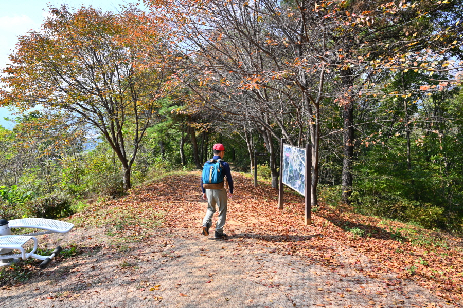 참나무와 활엽수가 무성해 조망은 없습니다. 정상석 뒤로 2분 쯤 내려가면 사거리 길, 오른쪽 대병저수지(2.3㎞)로 갑니다. 직진은 상림과 천년의 정원 방향이며, 왼쪽은 취재팀이 출발했던 여중 후문(늘봄가든 입구)에서 오는 길입니다.