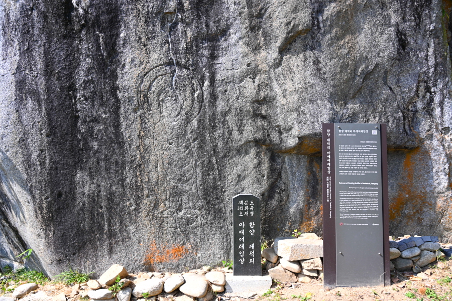 이곳에서 무덤을 내려가면 왼쪽에 바위가 약간 보이는데, 그 바위를 돌면 직벽에 함양 대덕리 마애여래입상이 새겨져 있습니다.