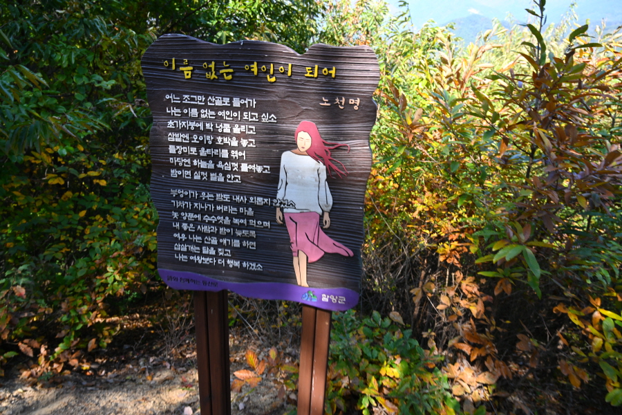 울창한 소나무 숲길로 ‘시와 함께하는 등산로’ 입니다. 짙은 솔향에 서정주의 ‘국화 옆에서’, 노천명의 ‘이름 없는 여인이 되어’ 등 유명 시인의 시를 음미하며 걷는 길은 그래서 더욱 운치 있습니다.