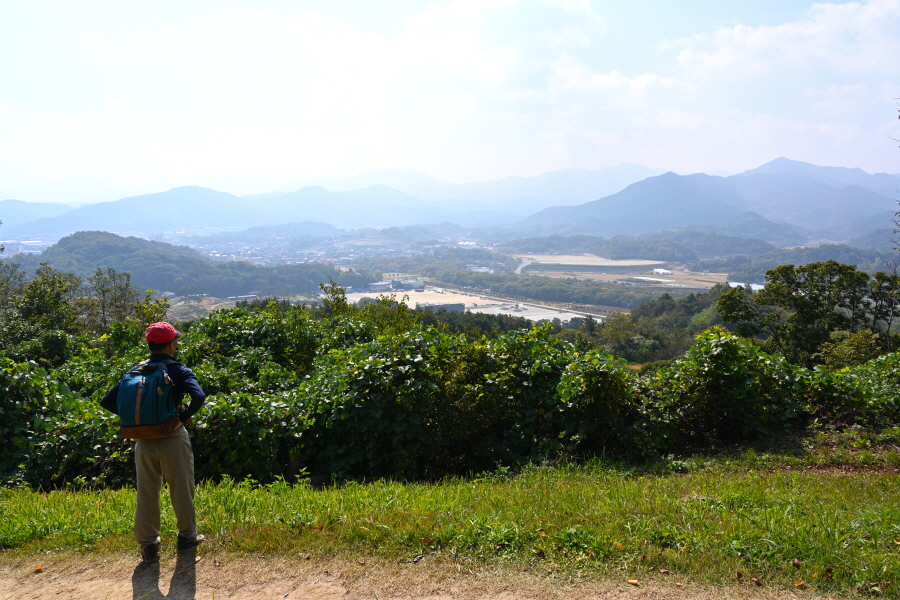 15분이면 운동기구가 설치된 능선 정상의 산불초소에 도착합니다. 남쪽 지리산 방향으로 조망이 열립니다. 함양읍 뒤로 멀리 와불산 지리산 중봉과 천왕봉 법화산 오도재 삼봉산 천령봉 옥녀봉 오봉산과 연비산이, 발아래에는 필봉산과 상림공원이 펼쳐집니다.