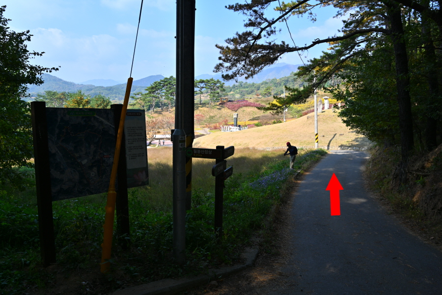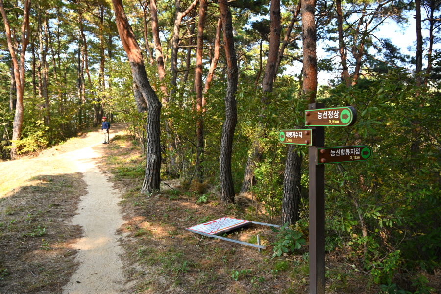 안부 삼거리에서 왼쪽으로 천년의 정원 외곽을 돌면 이내 사거리 길, 이번에는 오른쪽 ‘능선 정상(1.0㎞)’으로 꺾어 천년의 정원을 벗어납니다.