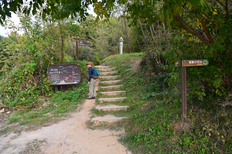 약 100m 쯤 올라가면 갈림길이 나옵니다. 약식 안내도와 이정표가 있습니다. 필자는 필봉산 정상을 가려고 아무 표시가 없는 오른쪽 계단을 갑니다. 왼쪽은 등산로·정수장(0.53㎞) 방향이며 두 길은 필봉산 정상을 지나 사거리에서 만납니다.
