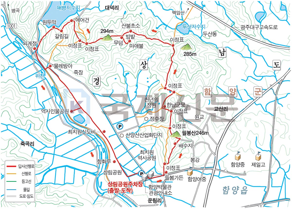 최치원 산책로 경로를 보면 상림공원 주차장에서 출발해 늘봄가든 입구~정수장 입구 갈림길~필봉산 정상~상림·여중후문·대병저수지갈림길~고개 삼거리(능선 정상·원교마을 갈림길)~한남군묘~천년의 정원~천년의 정원 위 사거리~대병·두산 저수지 갈림길~산불초소~마애불~상림·대병저수지 갈림길~대병저수지~뇌계정 앞 삼거리~상림공원 물레방아~역사 인물공원~최치원신도비~이은리석불~함화루를 지나 상림공원주차장에 돌아오는 원점회귀입니다. 최치원 산책로 거리는 약 6㎞이며 2시간 30분 안팎이 걸립니다. 상림공원과 천년의 정원 등 많은 볼거리와 단풍이 물든 산책로를 걷다보면 산행시간은 무의미합니다.