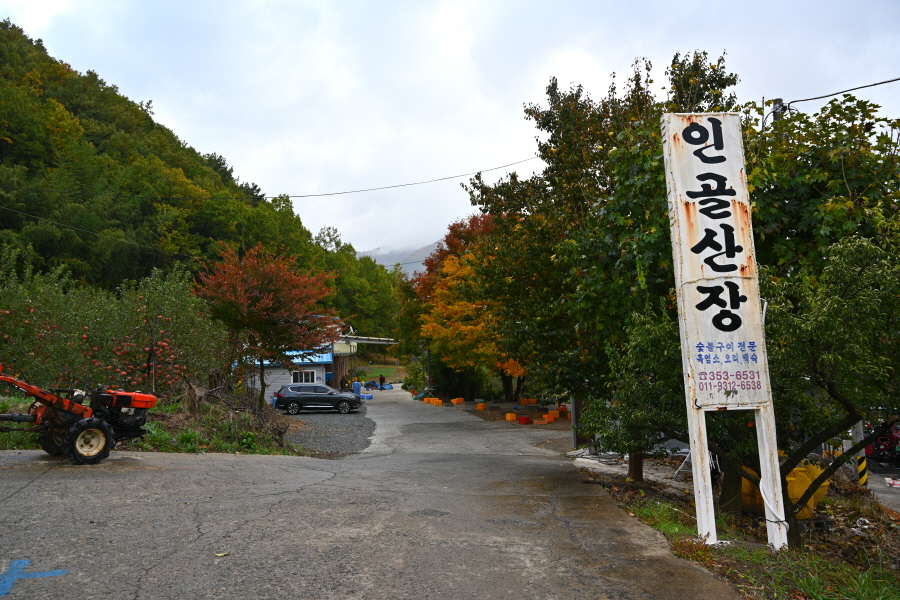 인곡교를 건너 사과 밭을 돌아가면 인골산장 입구에 도착합니다. 왼쪽은 가인저수지와 가인계곡 방향인데 이곳으로 하산합니다.