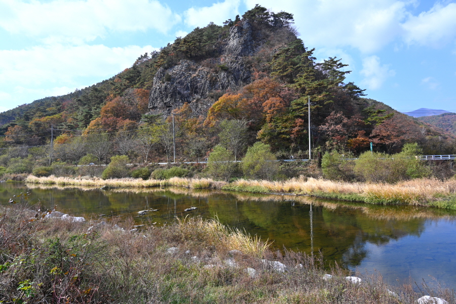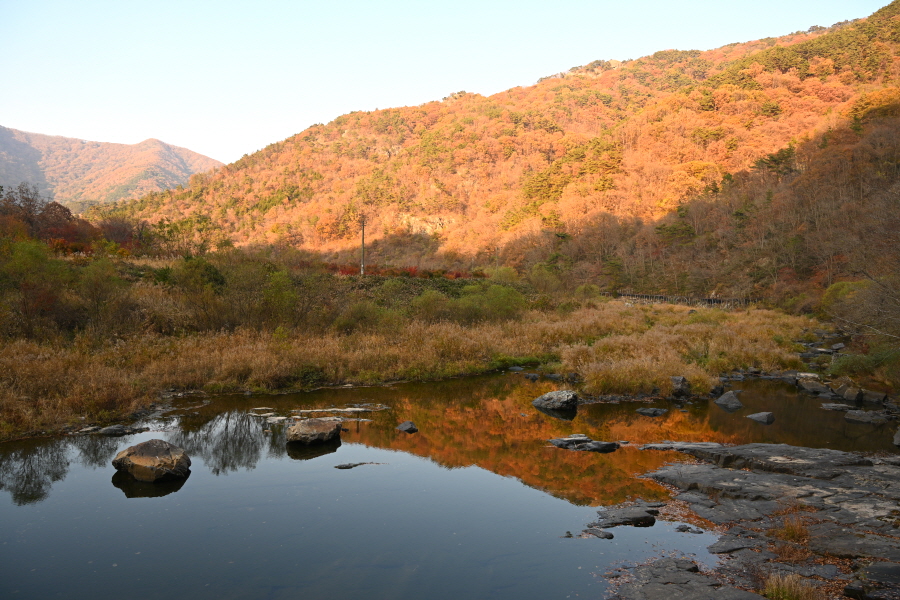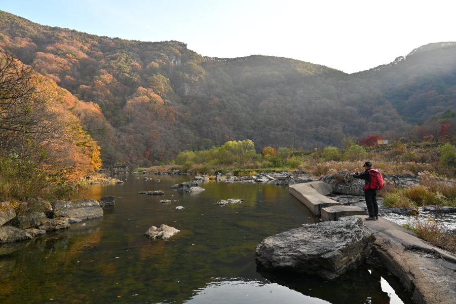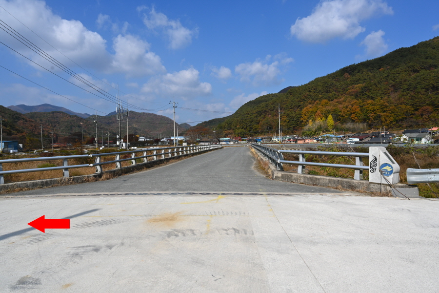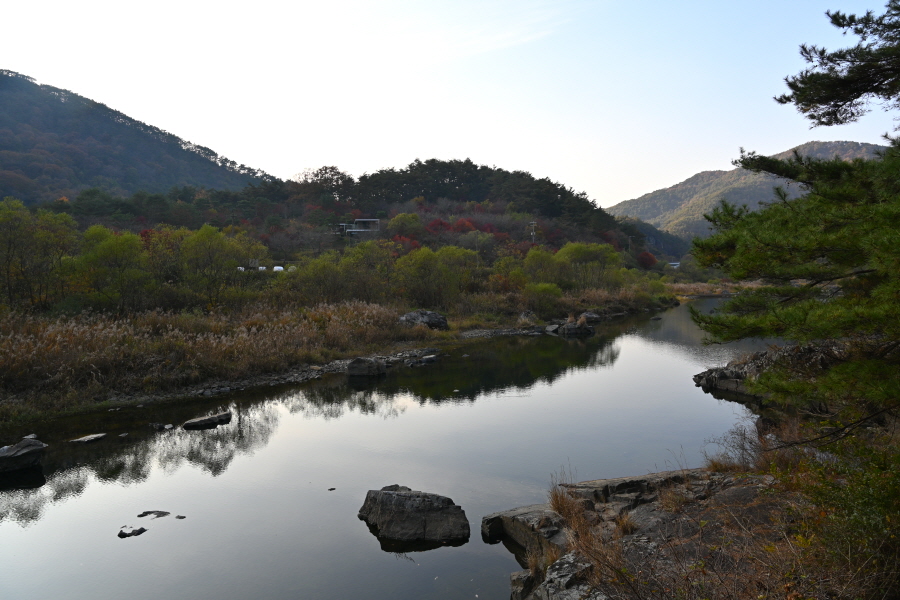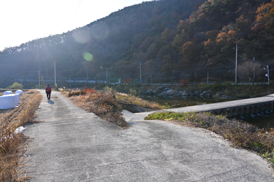 공룡발자국을 지나 치천을 U자 형태로 돌아 잠수교 갈림길에서 약 40분이면 금평교 주차장에 도착합니다.