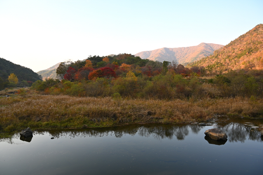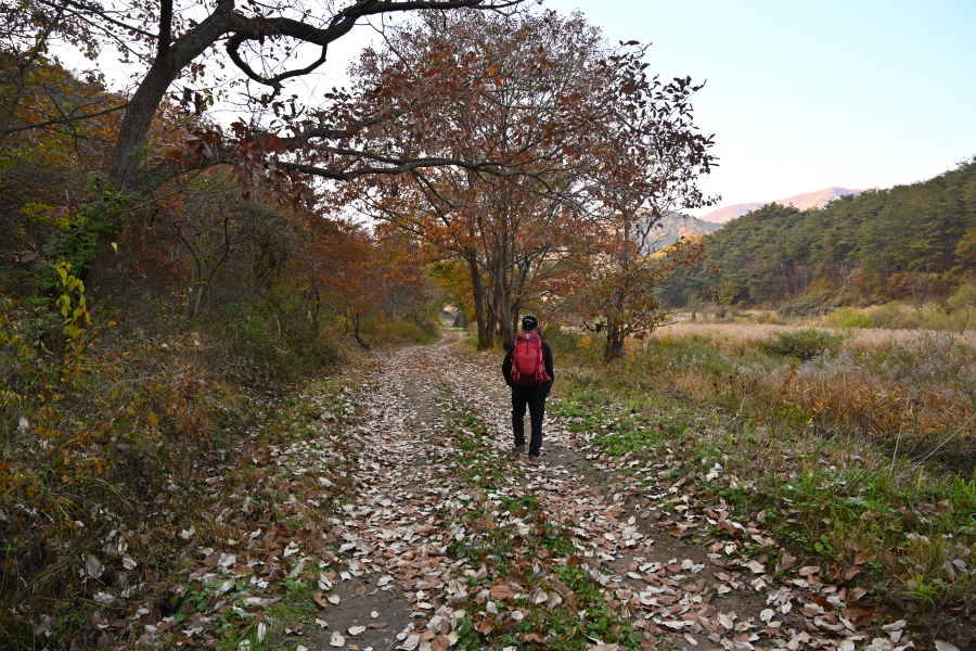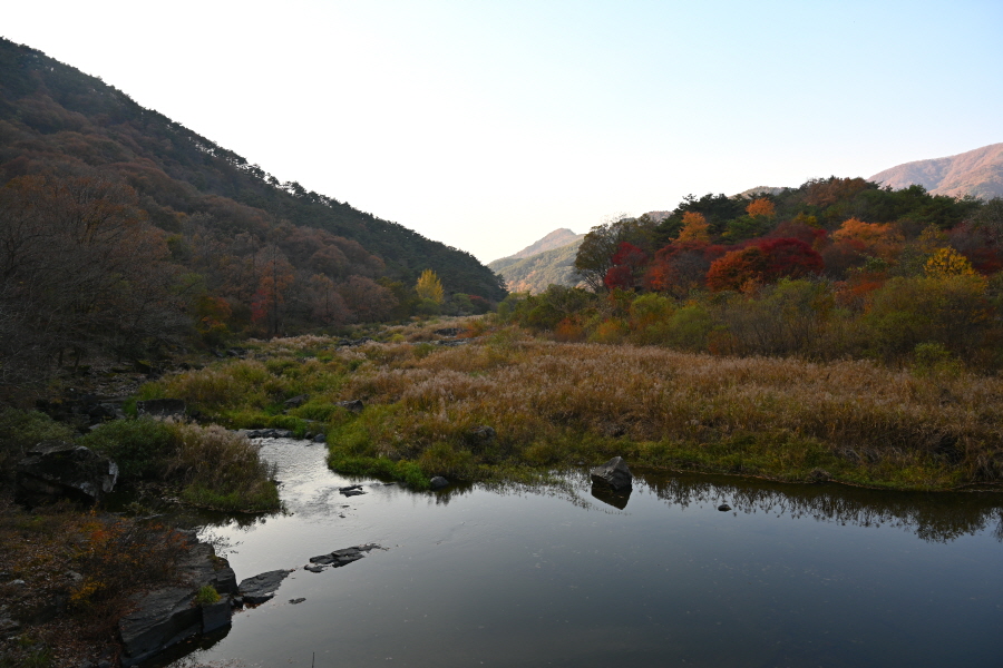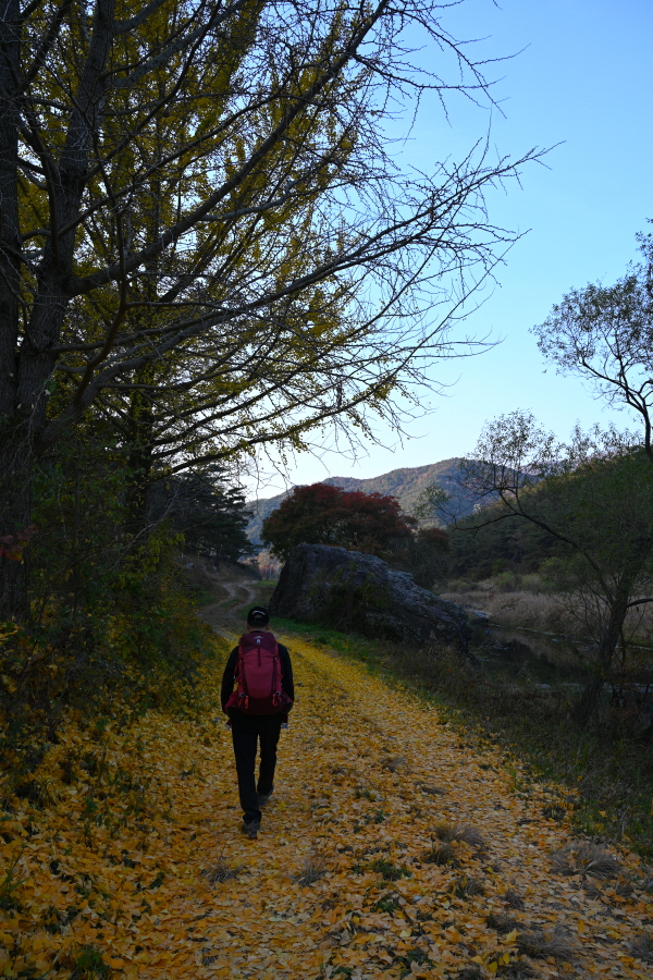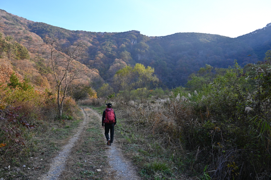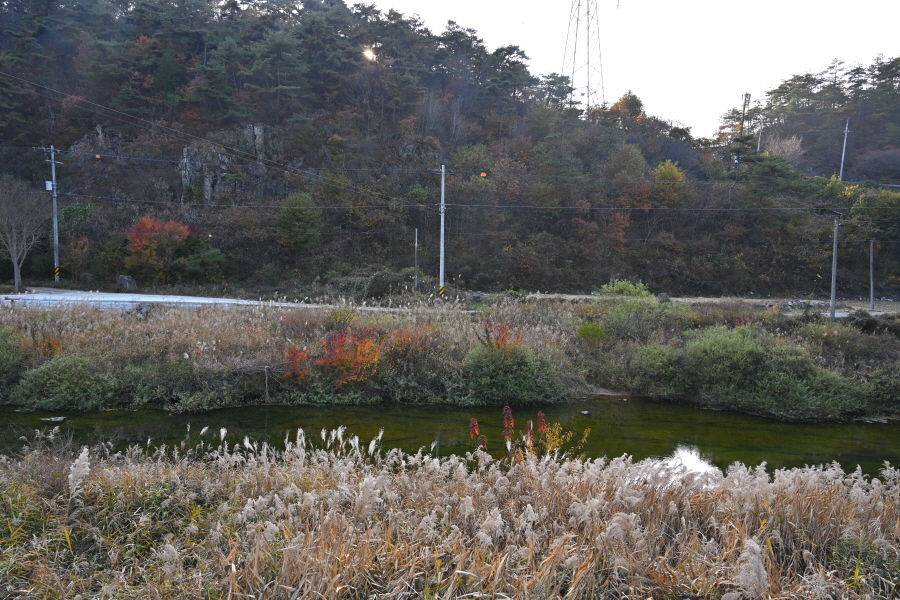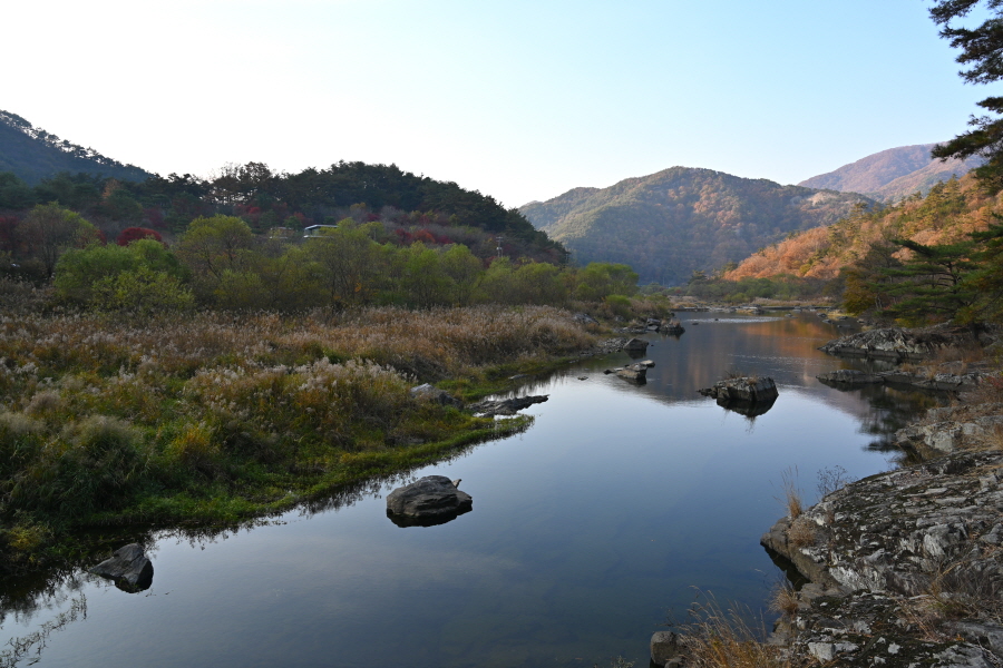 공룡발자국을 지나 치천을 U자 형태로 돌아 잠수교 갈림길에서 약 40분이면 금평교 주차장에 도착합니다.