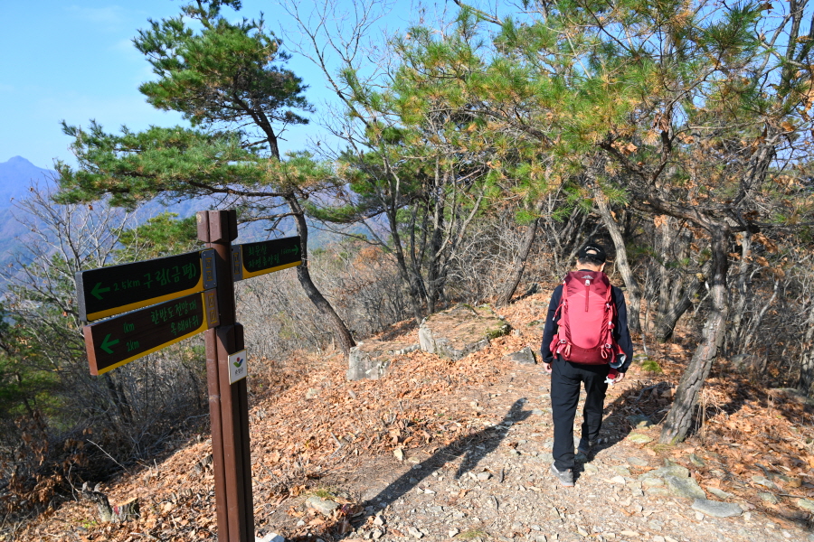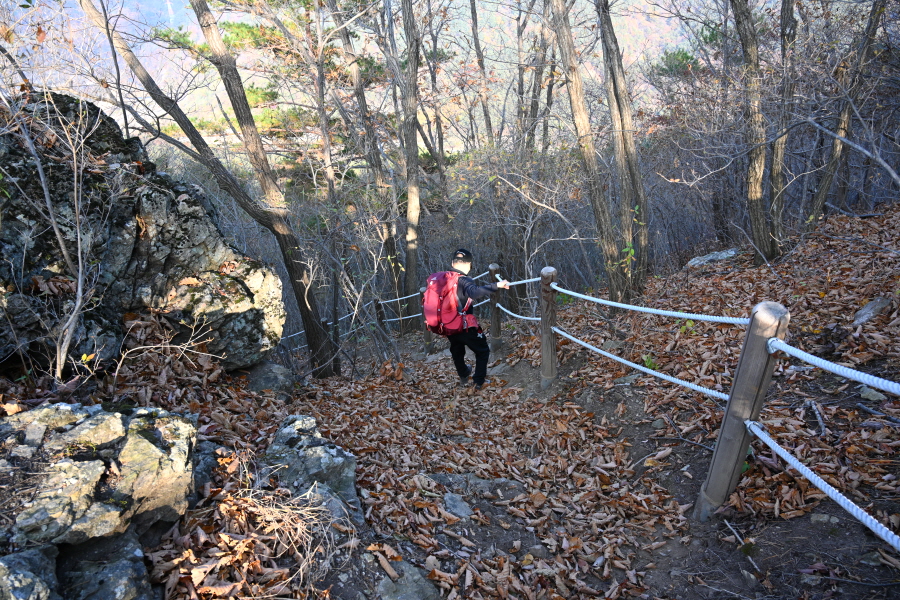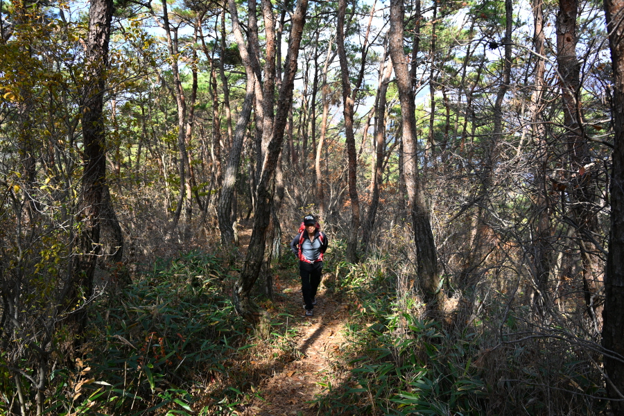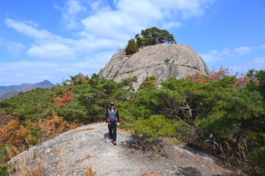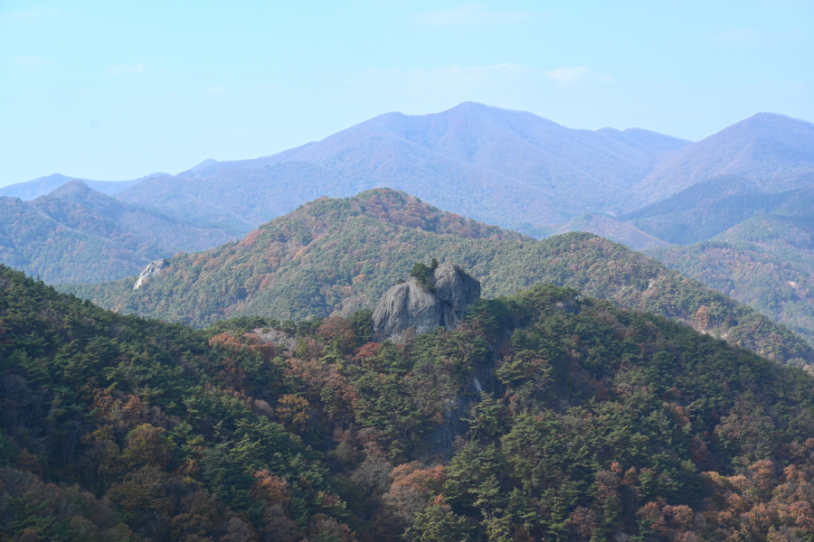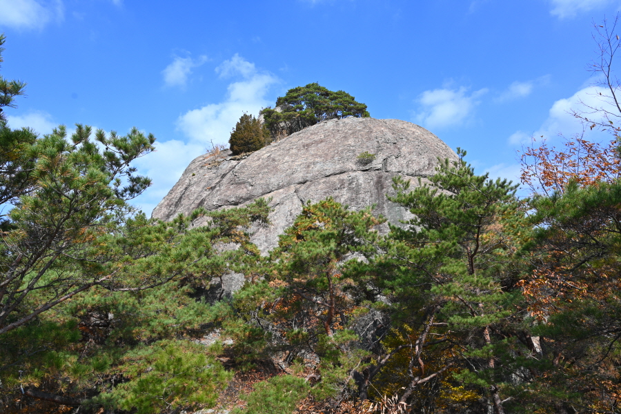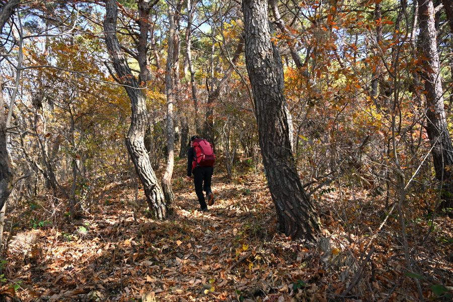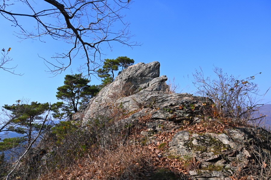 굴참나무와 소나무가 울창한 숲길이 이어집니다. 다시 나오는 갈림길에서 오른쪽으로 꺾어 가파른 통나무 계단을 올라 오래된 무덤을 지나갑니다. 집채만 한 바위를 돌아 능선에 올라서면 처음으로 조망이 열립니다.