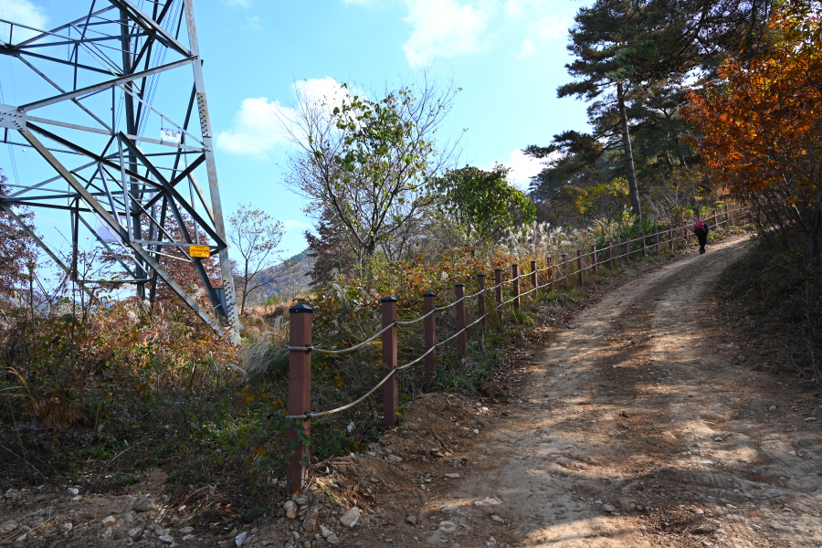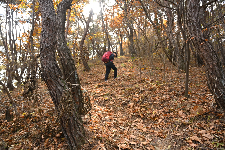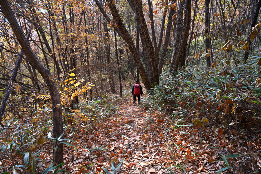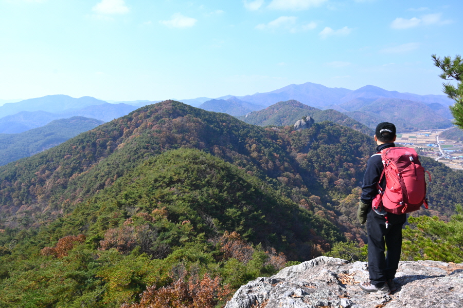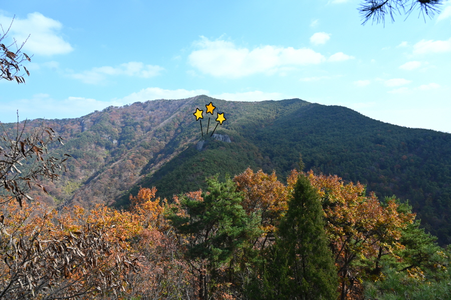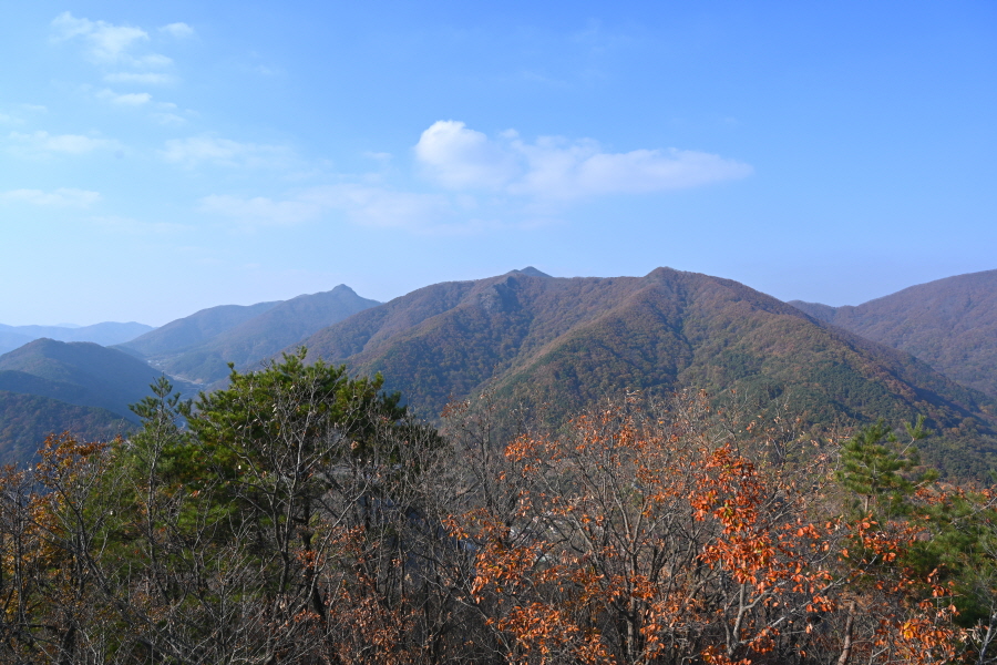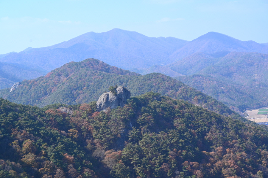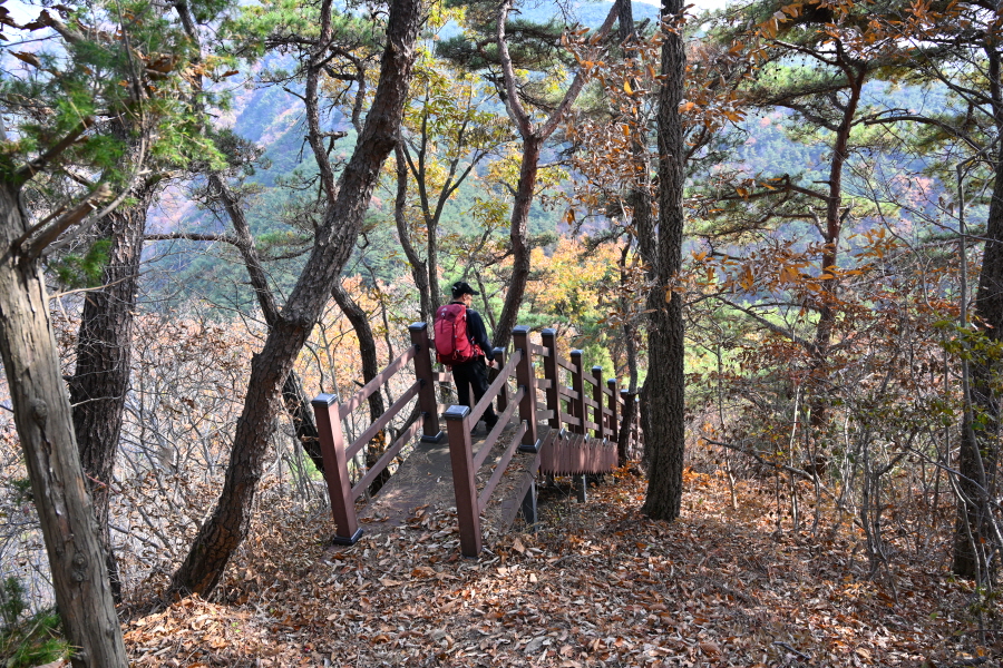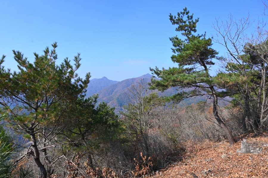 굴참나무와 소나무가 울창한 숲길이 이어집니다. 다시 나오는 갈림길에서 오른쪽으로 꺾어 가파른 통나무 계단을 올라 오래된 무덤을 지나갑니다. 집채만 한 바위를 돌아 능선에 올라서면 처음으로 조망이 열립니다.