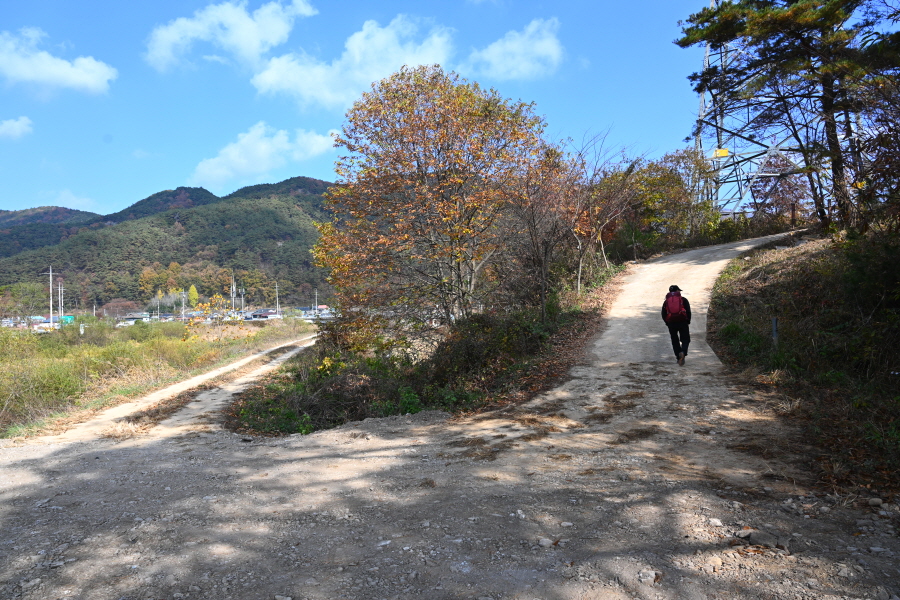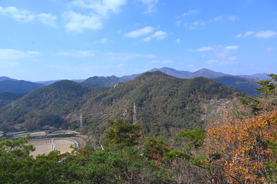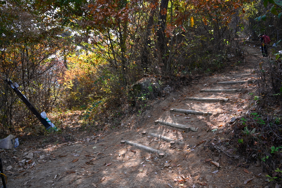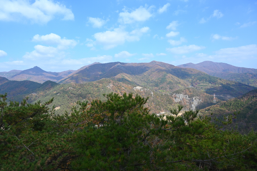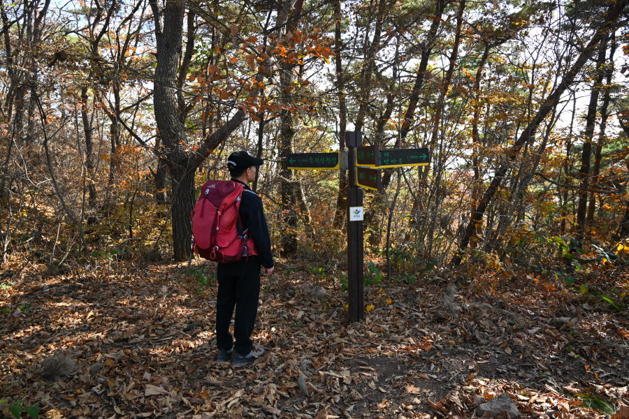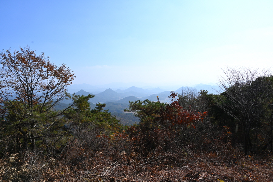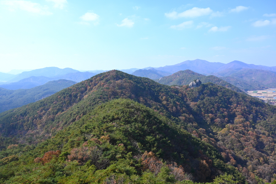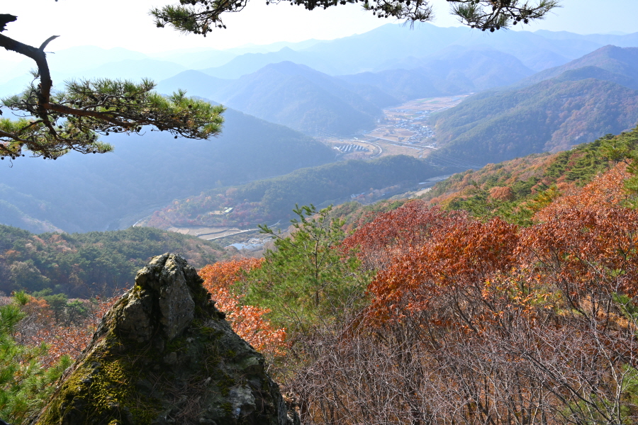 굴참나무와 소나무가 울창한 숲길이 이어집니다. 다시 나오는 갈림길에서 오른쪽으로 꺾어 가파른 통나무 계단을 올라 오래된 무덤을 지나갑니다. 집채만 한 바위를 돌아 능선에 올라서면 처음으로 조망이 열립니다.