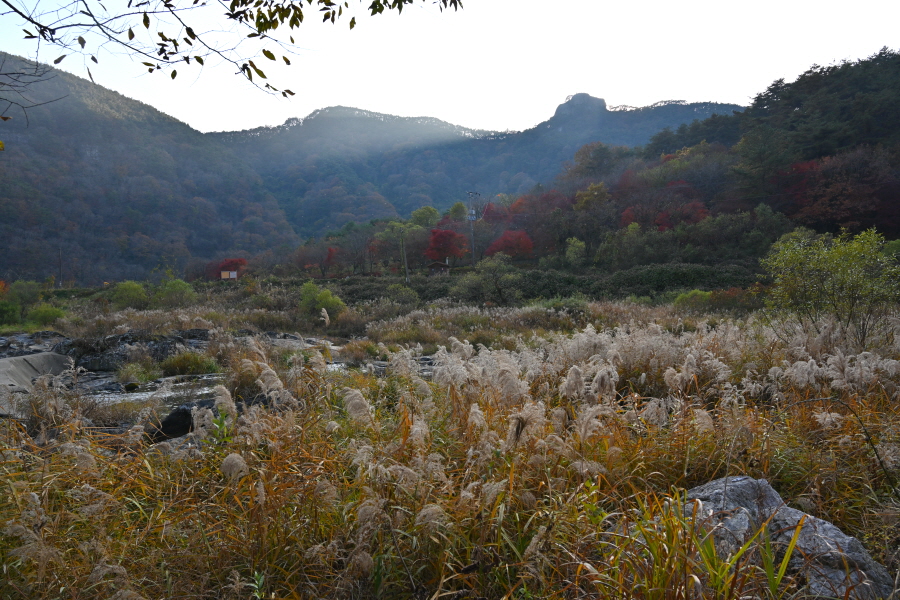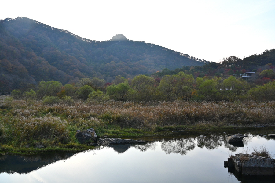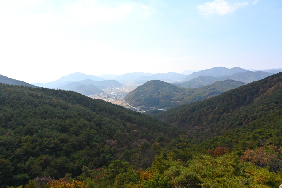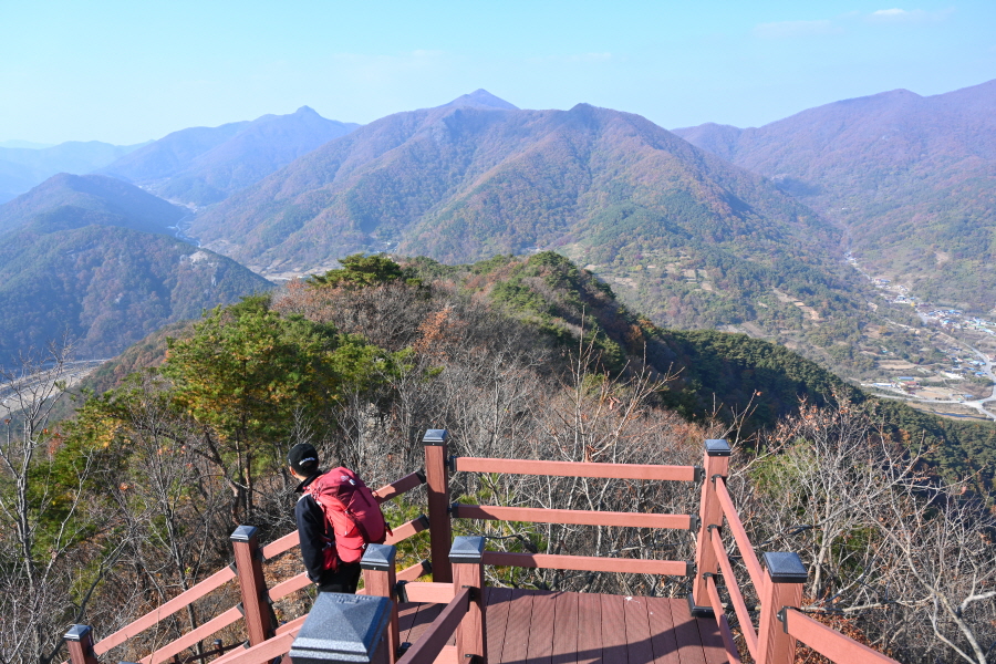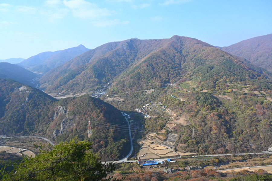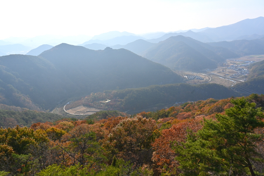정면 회문산 산비탈에 무학대사가 이성계의 등극을 기원하며 1만 일 동안 기도를 올린대서 유래한다는 만일사(萬日寺)가 보입니다. 회문산 오른쪽은 깃대봉이며, 왼쪽 암봉은 알프스의 마터호른을 닮았다는 장군봉입니다.