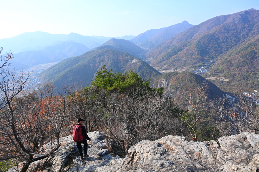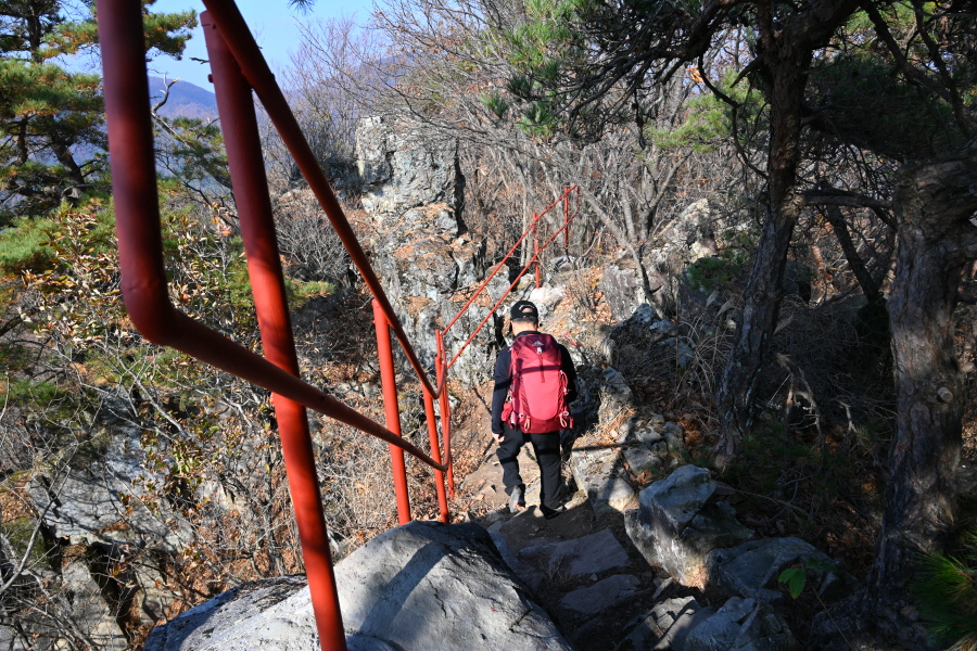 두꺼비 바위를 돌아 짧지만 전망이 열리는 바위 능선을 지나 산길은 가파르게 내려갑니다.