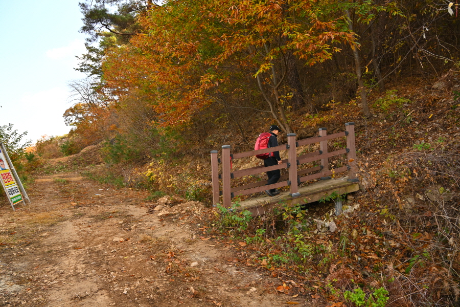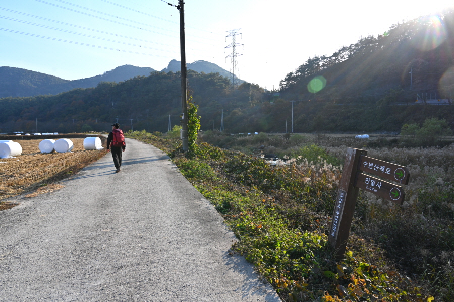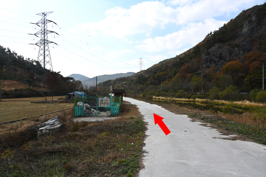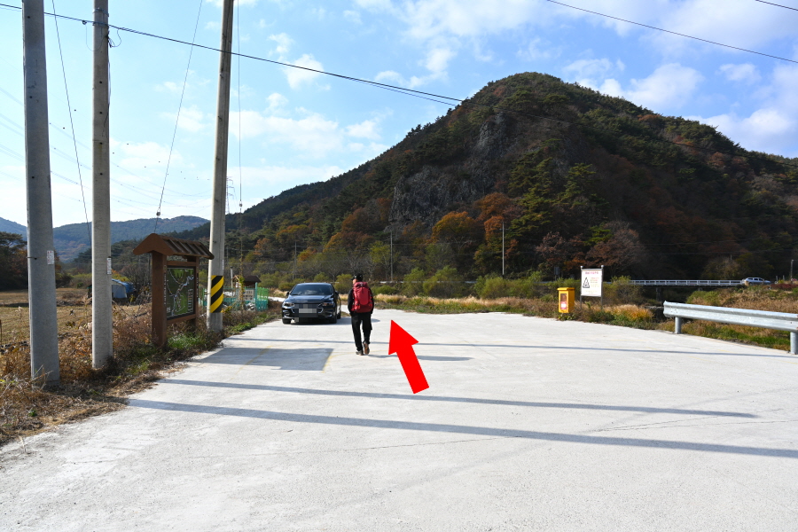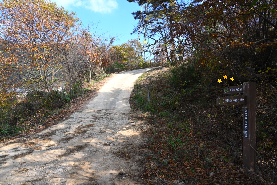 정면의 산이 가야 할 무직산이며 산행은 오른쪽 영농 폐비닐 집하장과 간이 화장실을 지나 수변 산책로를 150m쯤 가면 왼쪽에 호정소 등산로 이정표가 나옵니다. 본격적인 산행 들머리입니다.