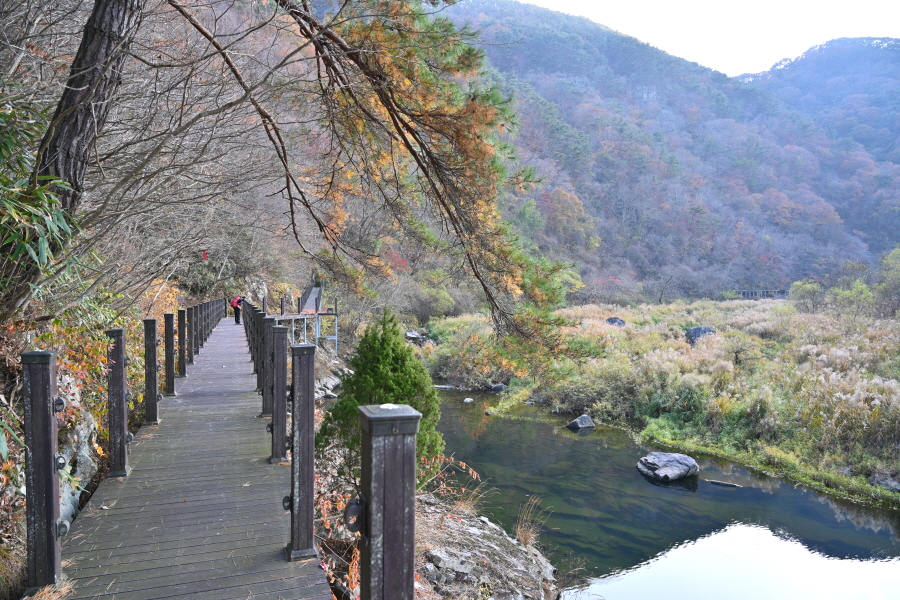 안전난간이 설치된 바위 능선 왼쪽의 편평한 암반 전망대와 곧 나오는 전망 덱에서 치천이 물돌이 하며 빚어놓은 지형지물은 남녀의 합궁 장면을 ‘현실감 있게’ 보여줍니다.