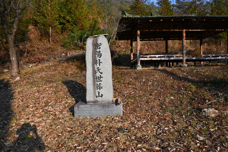 잠수교와 이정표 앞 갈림길에서 직진해 ‘밀양 박씨 세장산’ 표석을 지납니다.
