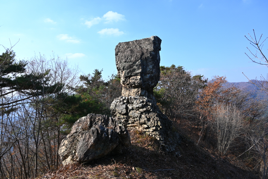 덱 계단을 지나 5분이면 5m 높이의 선돌을 만납니다. ‘스핑크스·삼신할머니·불바위’로 불리는데 스핑크스는 산꾼들이 부른다면, 삼신할머니 바위는 아이를 낳지 못하는 분이 올라와 기도하면 소원을 들어준다 해서 마을에서 부릅니다. 불바위는 만일사에서 부르는데 ‘부처바위’를 뜻합니다.