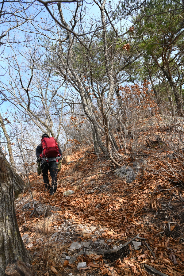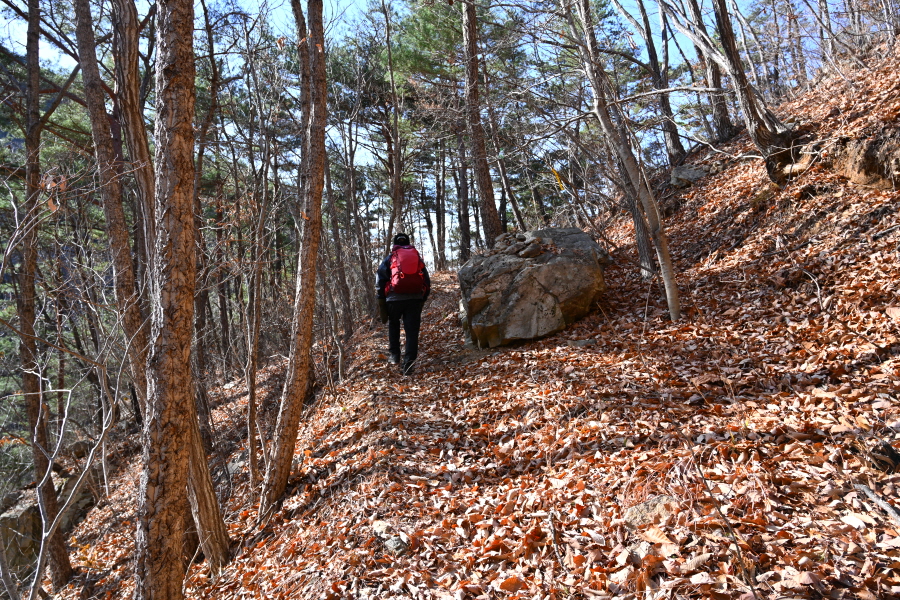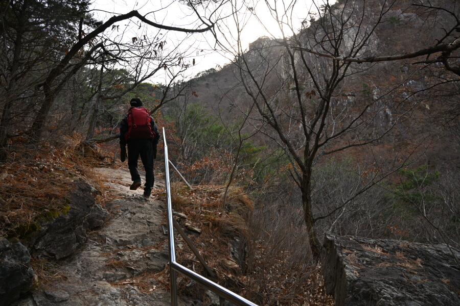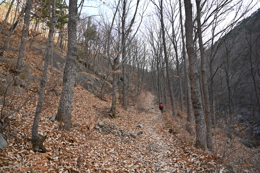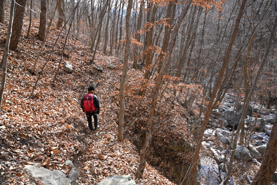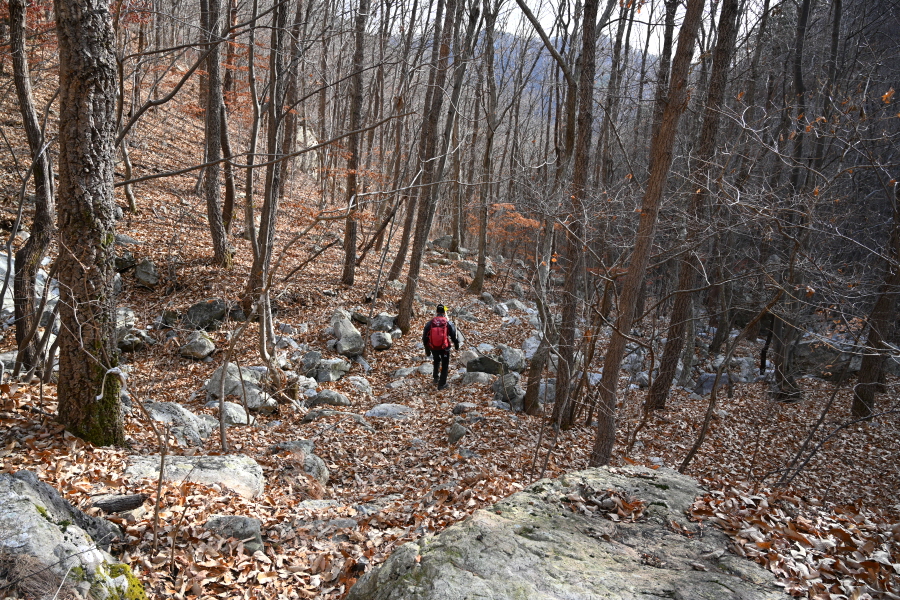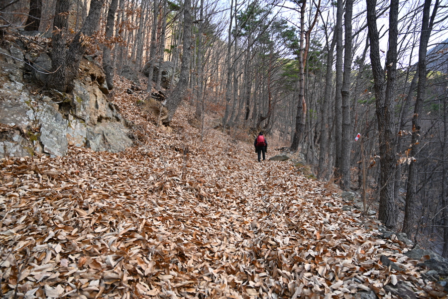 팔풍재에서 석골사로 하산하는 길은 돌길에 낙엽이 덮여 있어 미끄러지지 않도록 합니다.