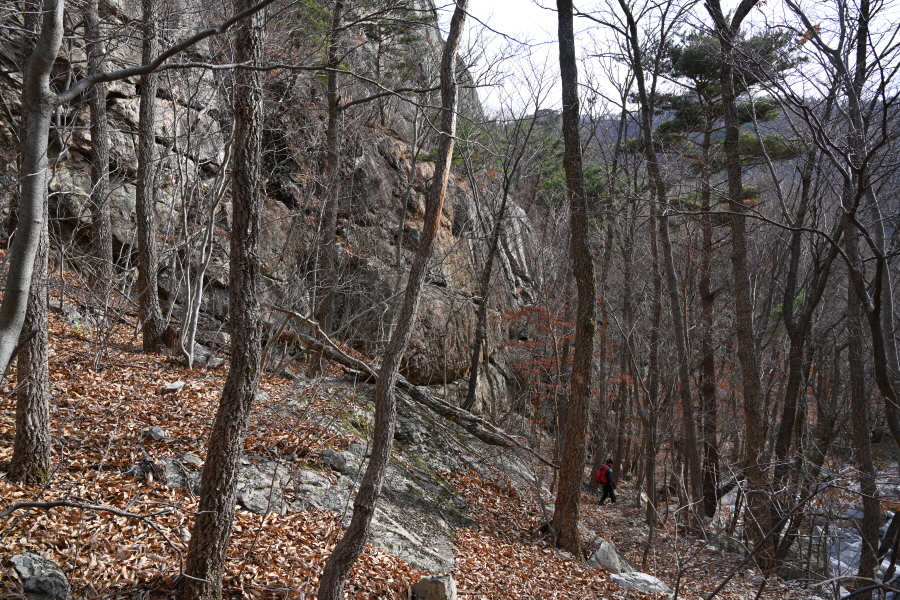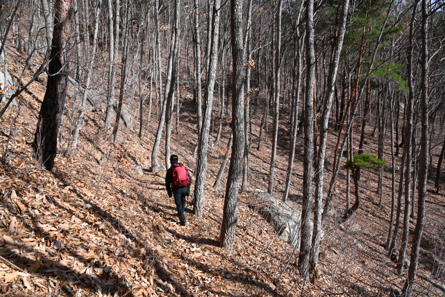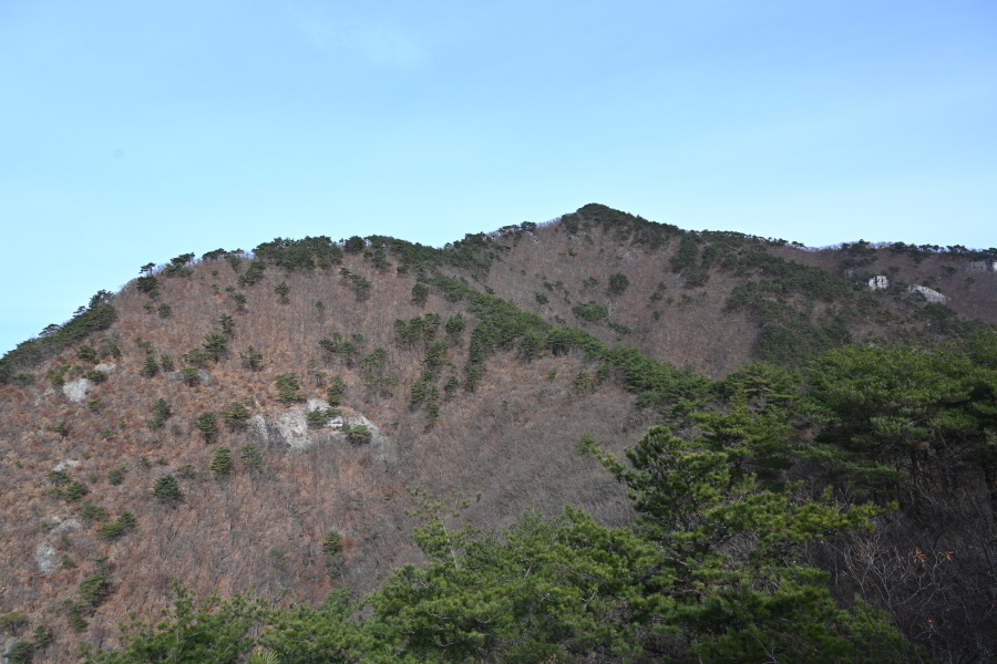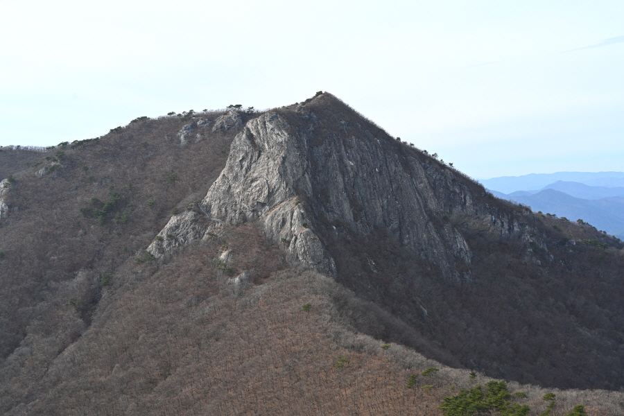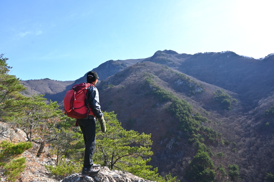잇단 전망대를 지나 남릉 입구에서 약 45분이면 범봉 정상부가 보이는 전망대를 끝으로 평탄한 솔 숲길이 5분쯤 이어집니다.