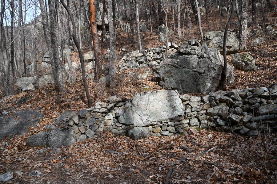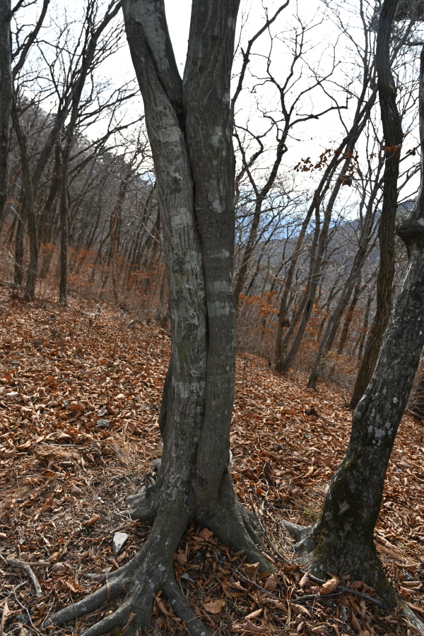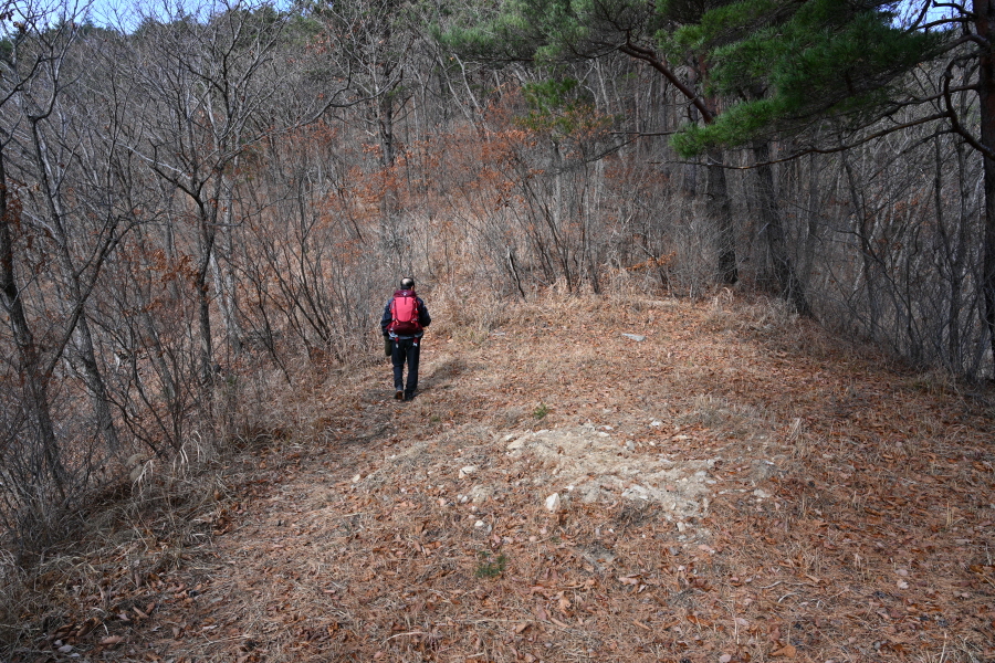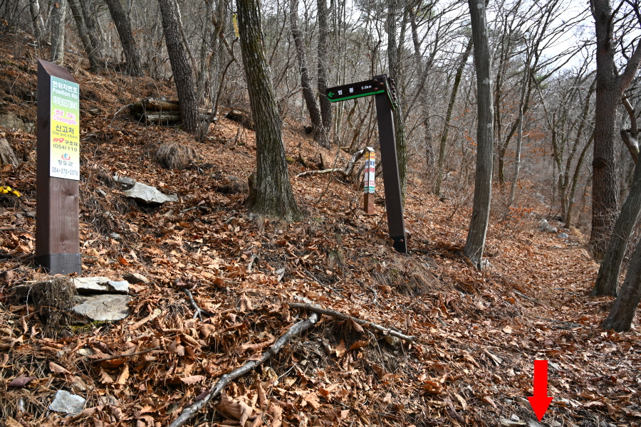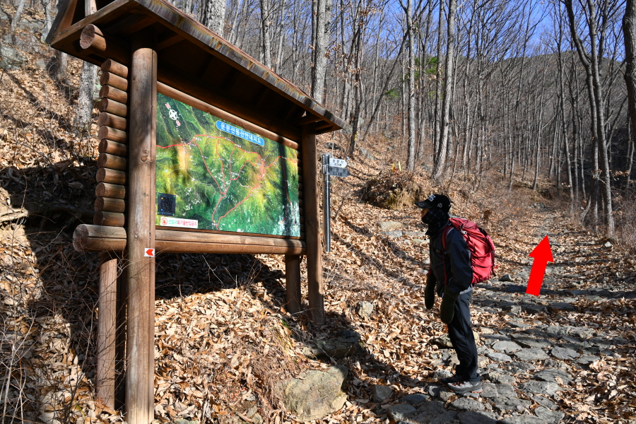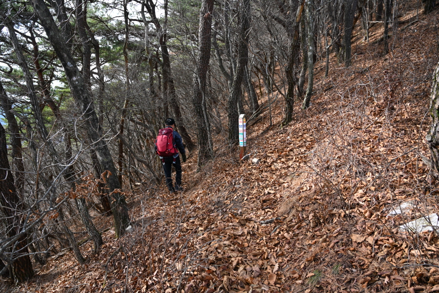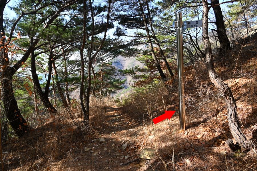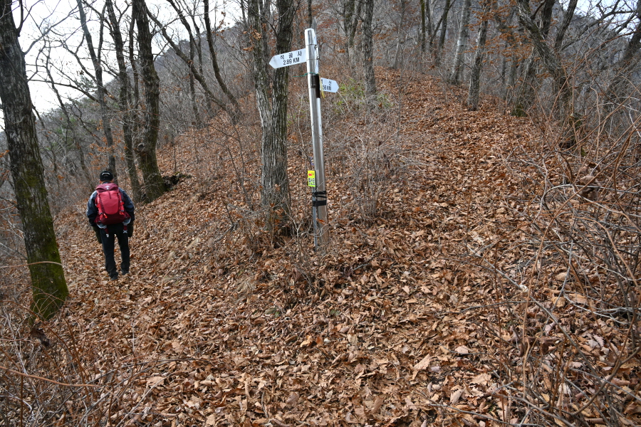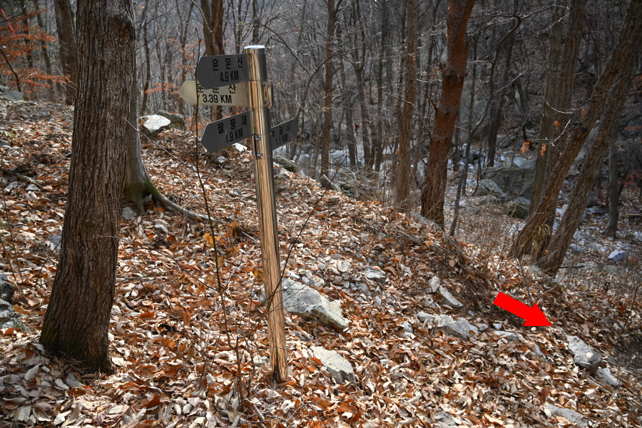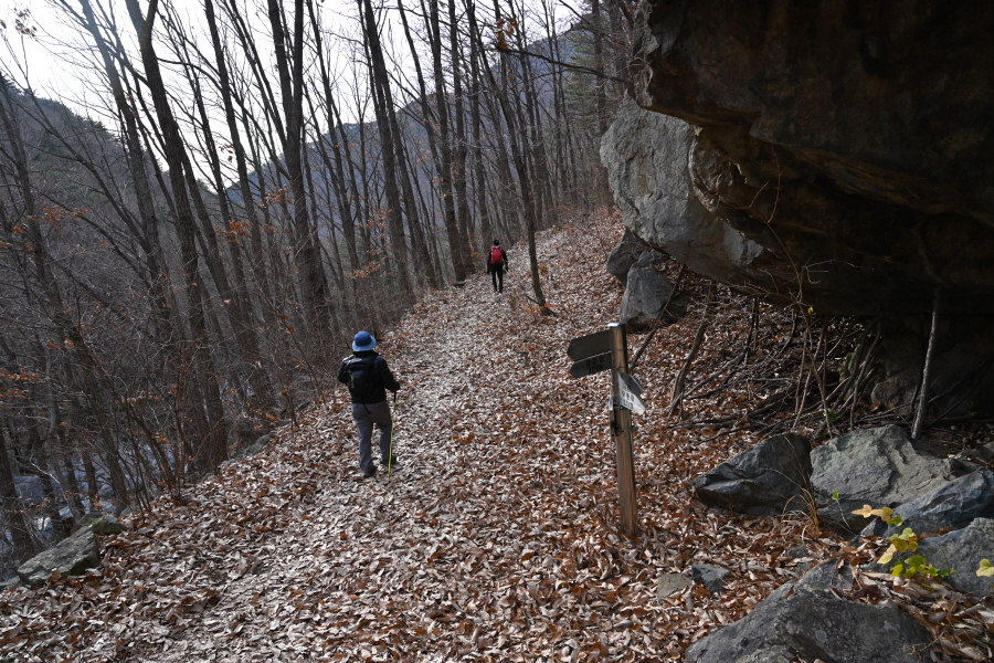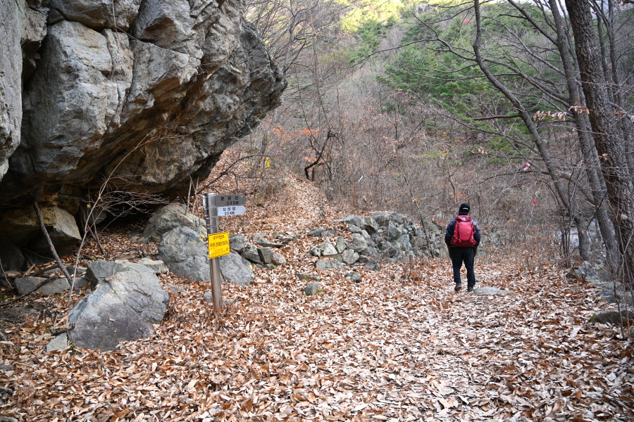 낙엽을 다 떨군 키 큰 참나무 숲의 너른 길이 한동안 이어집니다. 산더미 같은 바위가 엎어질세라 나무 막대기를 받쳐놓은 갈림길에서 운문산 (3.8㎞)방향으로 직진합니다. 왼쪽은 팔풍재 방향이며, 필자의 하산길입니다.