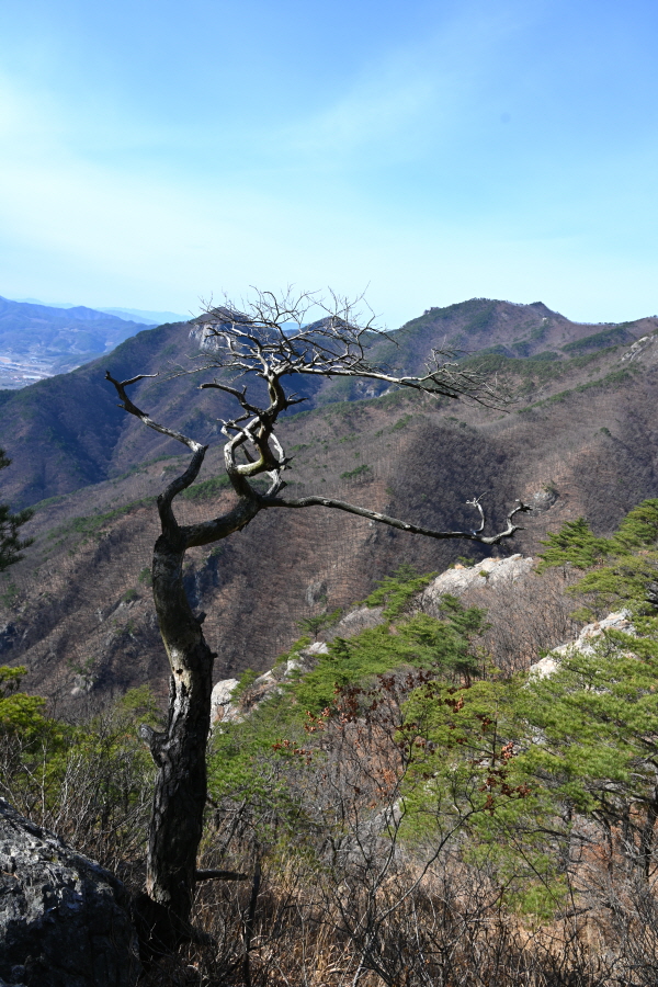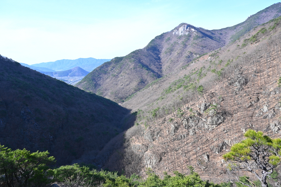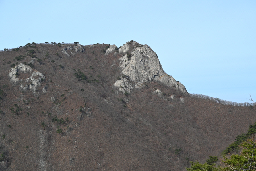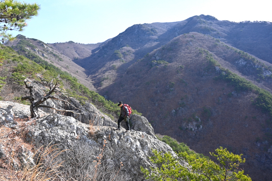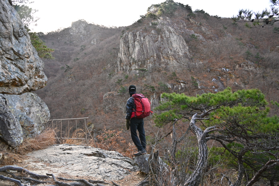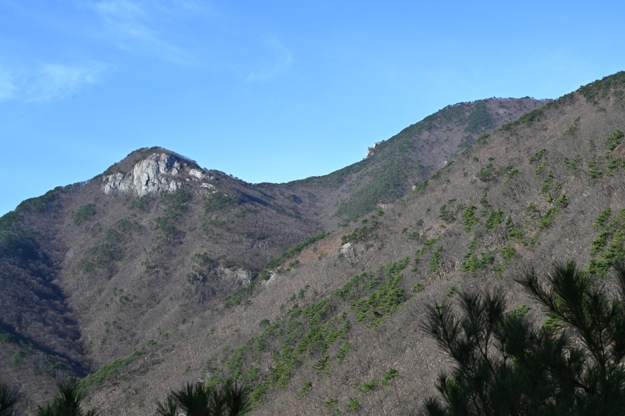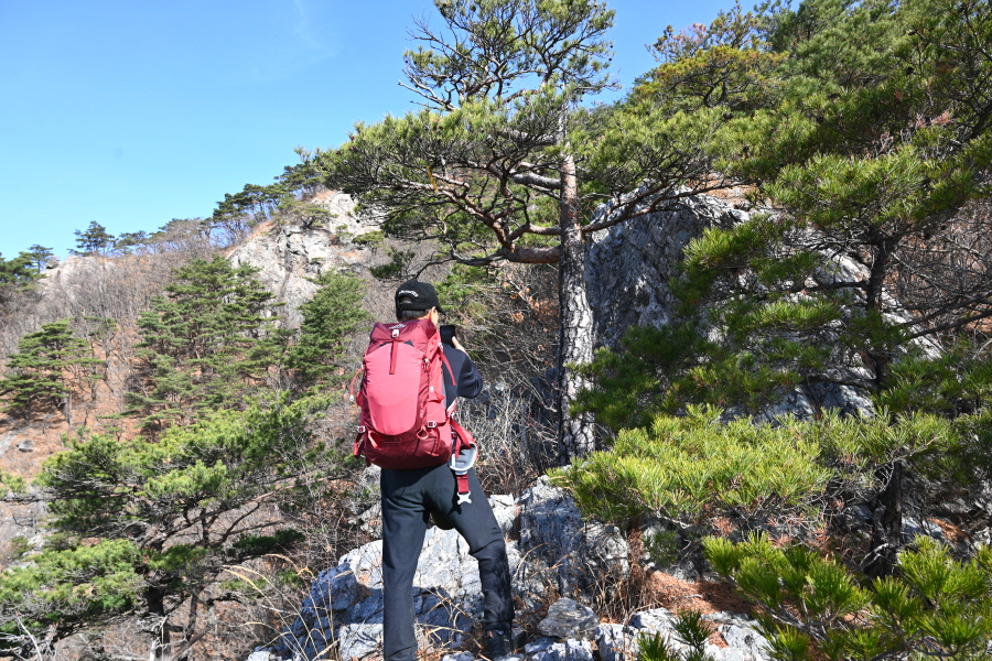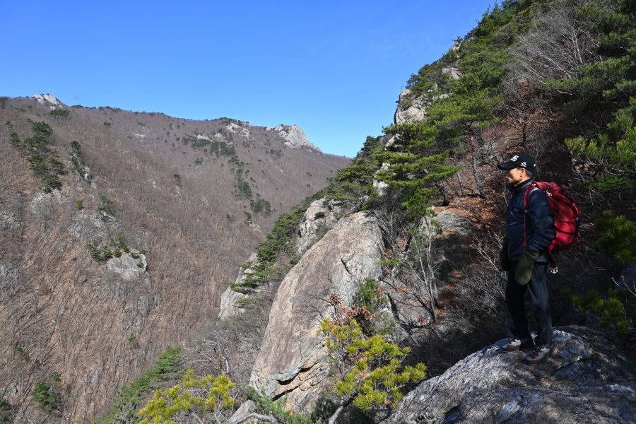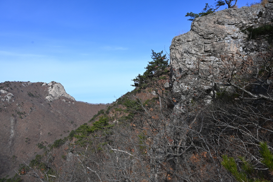 건너편 바위 낭떠러지 중간에 사람 코를 닮은 바위 뒤로 억산과 깨진 바위가 보이며, 암반에 뿌리를 내린 ‘천년송’이 한폭 산수화를 그려냅니다.