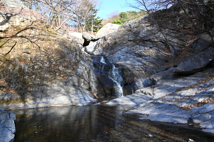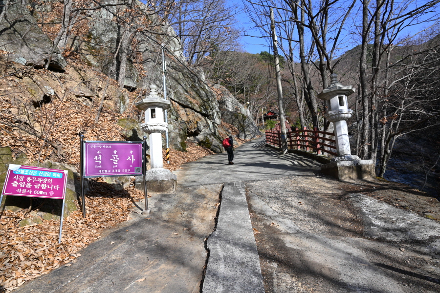 승용차를 이용했다면 석골사주차장에서 출발합니다. 상운암 계곡은 골이 깊어 겨울 가뭄인데도 수량이 풍부했습니다. 약 12m 높이에서 2단으로 떨어지는 석골폭포를 보고 되돌아 나와 석골사를 둘러봅니다.