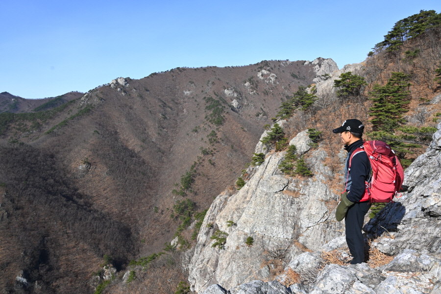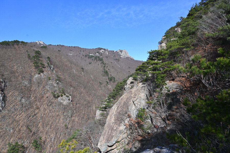 잔돌이 깔린 경사진 바위를 올라서면 다시 전망대입니다. 고도를 높일수록 더 넓게 조망이 열립니다. 이번에는 왼쪽에 간담을 서늘케 하는 천길 벼랑 위 전망대에 올라섭니다.