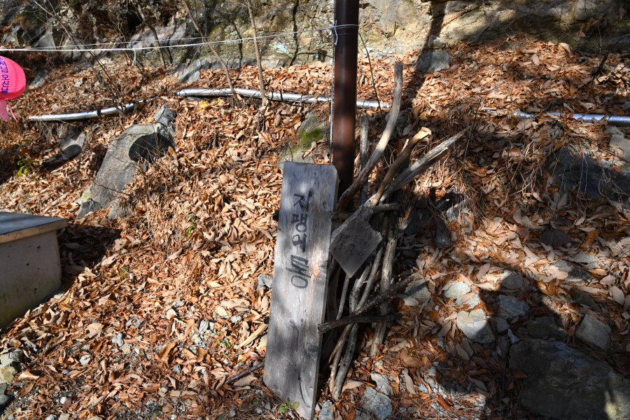 석골사 후문을 나가면 본격적인 산행을 알리는 ‘지팽이 통’이 놓였습니다. 지팽이는 지팡이를 뜻합니다. ‘내 다리에 힘 보태줄 지팽이 고맙습니다’란 글귀가 적혀 있습니다. 산길이 멀고 힘들 때는 ‘제3의 다리’인 지팡이가 큰 의지가 됩니다.