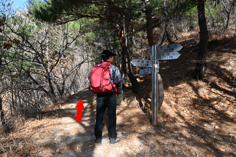 석골사에서 상운암을 오르던 옛길로 산허리를 3분쯤 완만하게 돌아가면 이정표 갈림길이 나옵니다,